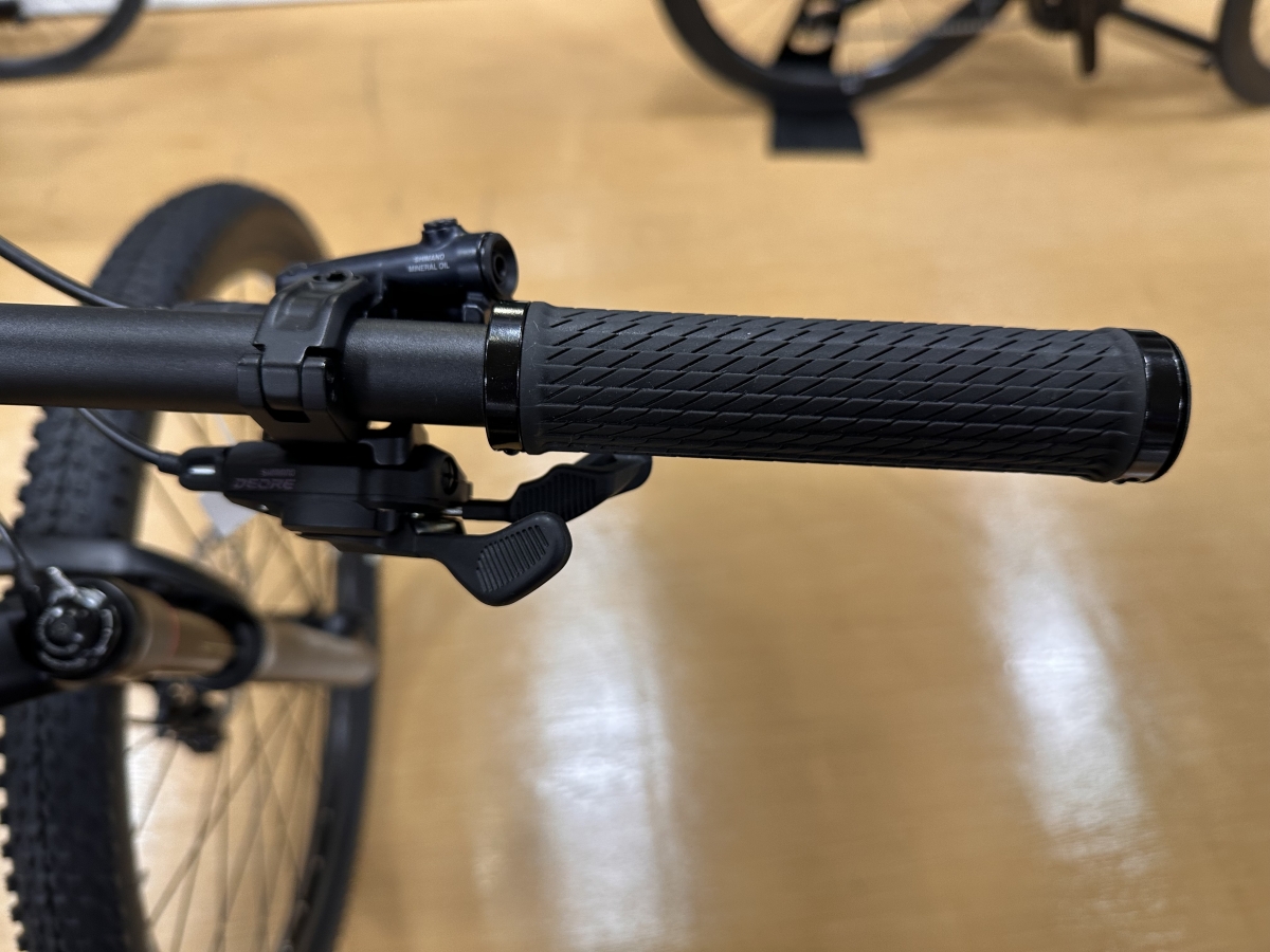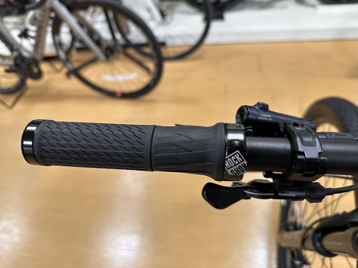 グリップは回せばサスペンションの動きをロックさせてと「ROCK SHOX」のボタンを押せば解除できます。もちろんドロッパーも付いています。走りながら操作ができて無駄がない本格的なレースでも使えますね。