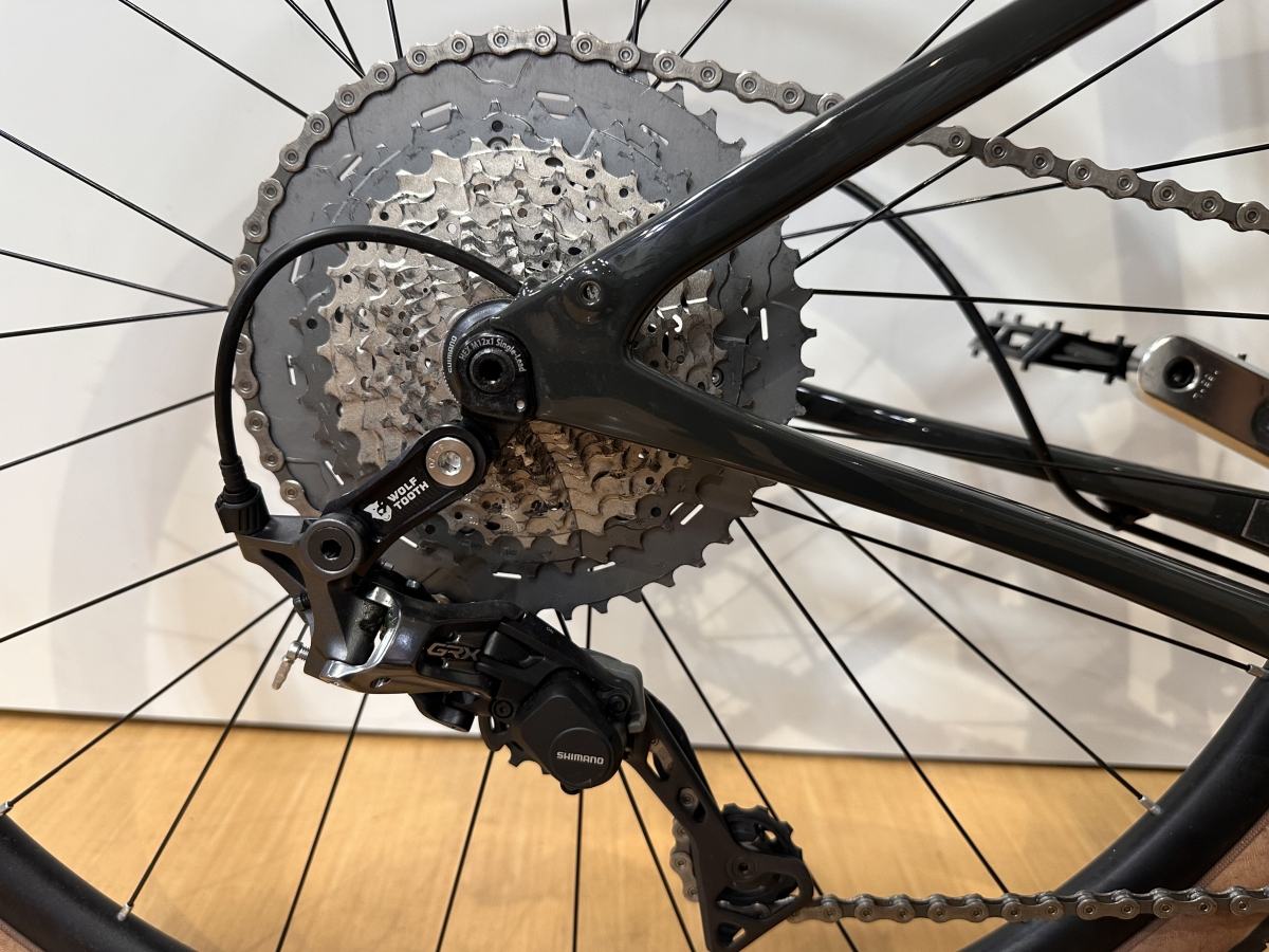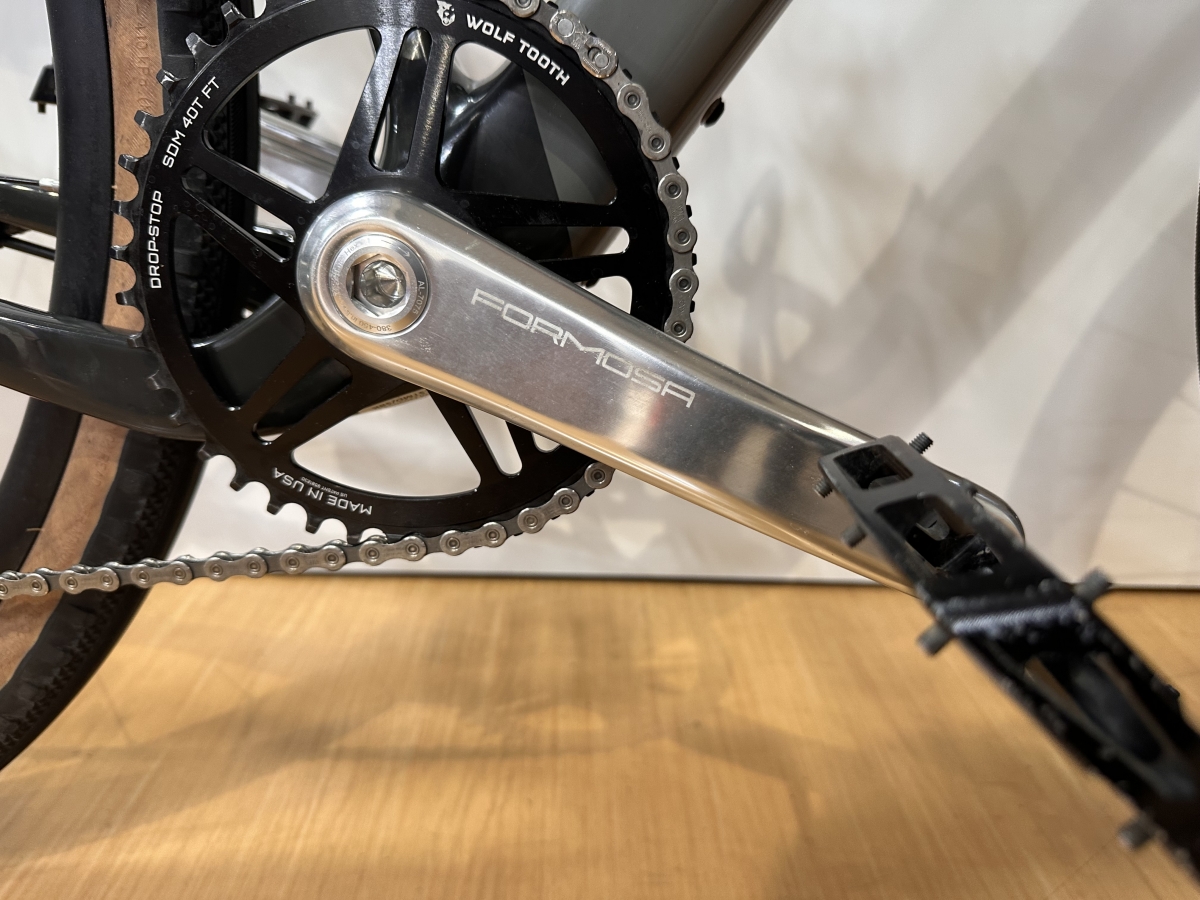 WOLF TOOTHのゴートリンクシマノワイドレンジを使ってフロントシングルに変更した代わりに46Tで登りが楽にしました。