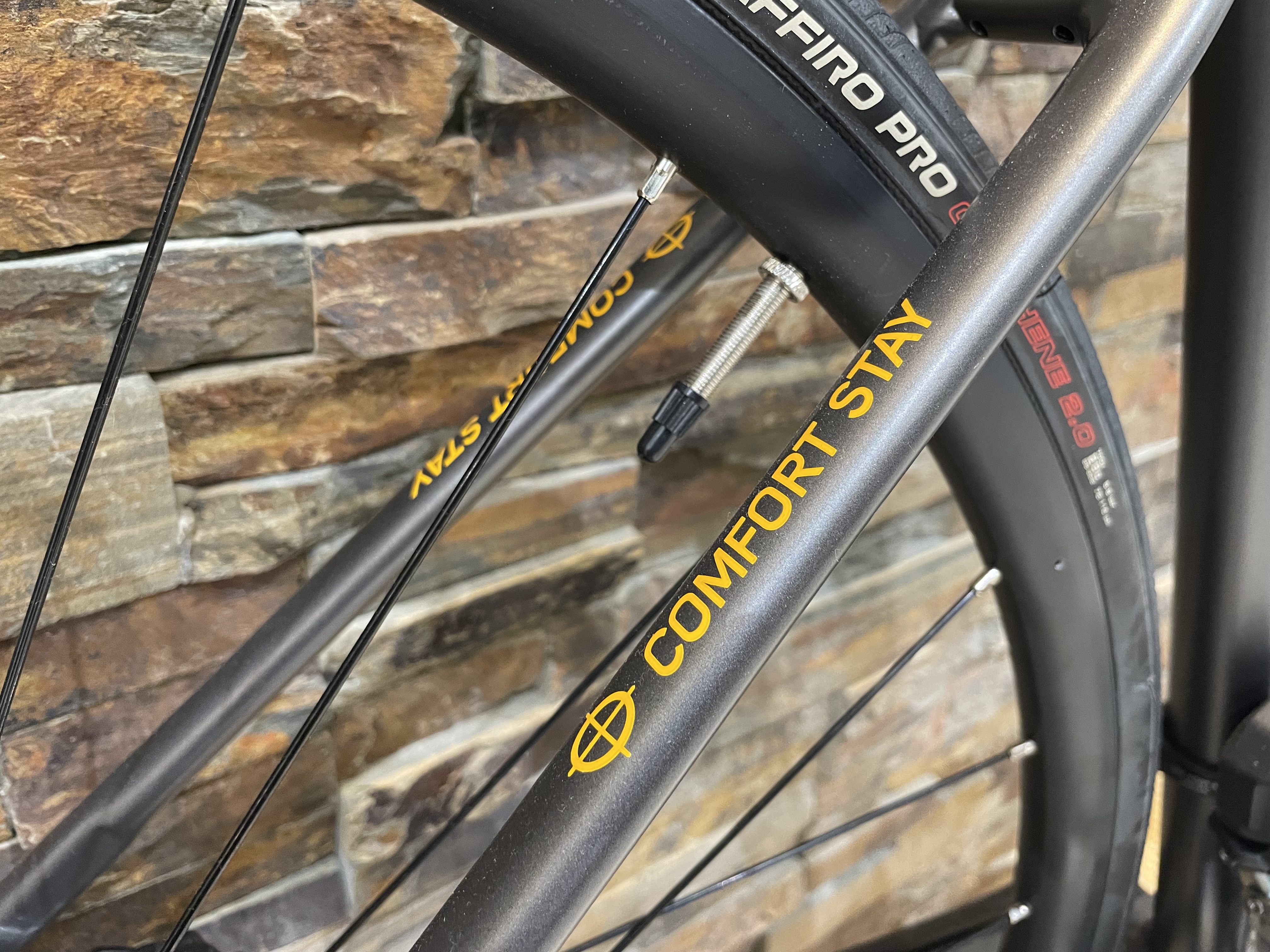コラテックはドイツブランドです。このドロミテに関しては日本人の体形に合わせて設計された日本オリジナルモデル。日本人の私たちが乗って最高の性能を発揮するように設計されています。また、トップチューブ長を重視した「プロサイズシステム」により、一人ひとりに合わせたポジション調整が容易に可能。シートステーには扁平加工が施され、快適な乗り味を実現しています。