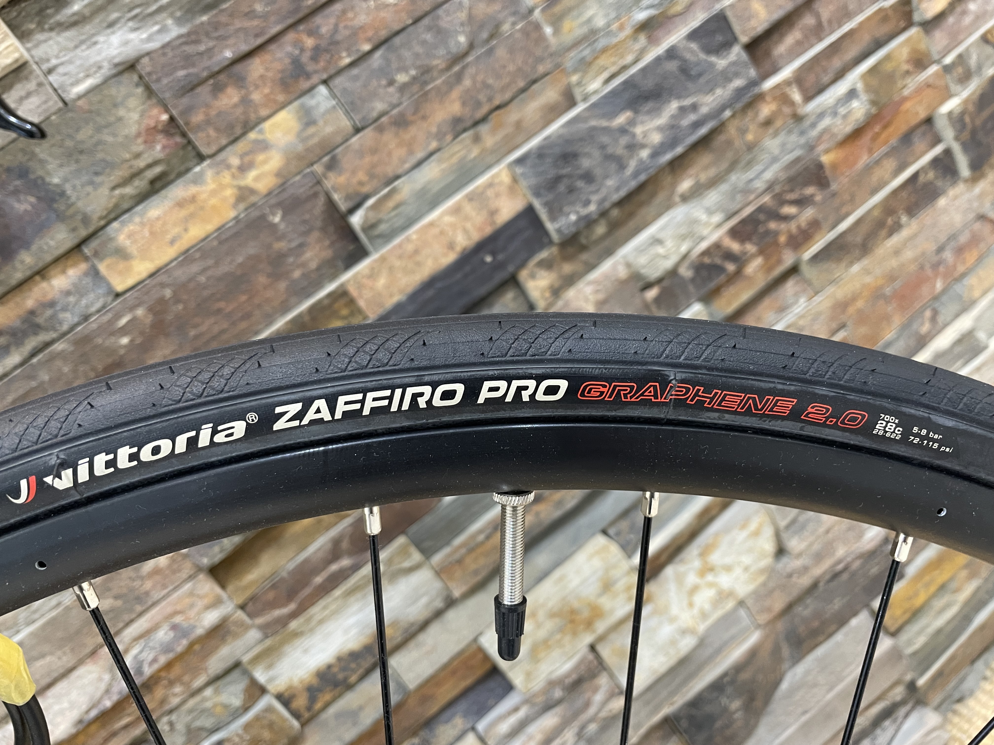 タイヤはvittoria製の28Cの物を採用。ロードバイクらしい軽快さと乗り心地の良さを兼ね備えています。上位モデルにも採用されているグラフェンを配合したタイヤは、転がり抵抗の低減、耐摩耗性の向上に貢献しています!