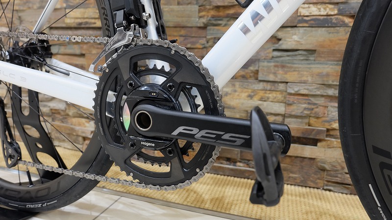クランクはマージーンのパワーメーター付きクランクを引き続き使用。実際にトルクがかかる部分での計測方式のため、正確性の高い両脚合計のパワーを計測することができます。