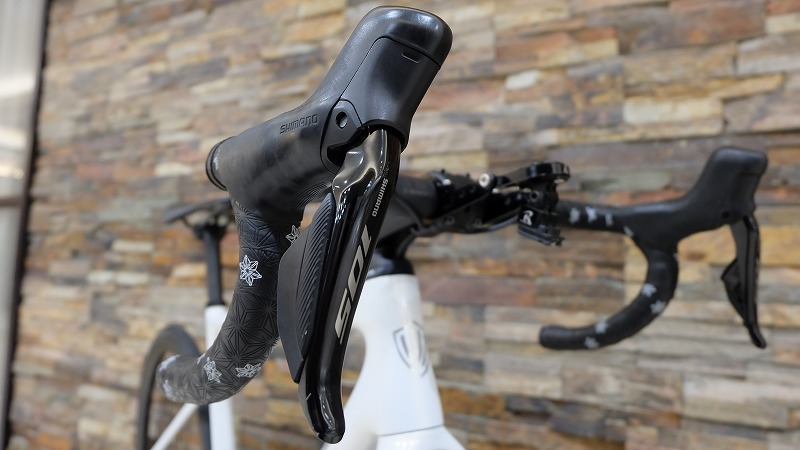 コンポーネントは105電動モデルを搭載。電動で変速が出来る為、滑らかに変速してくれます。リアのスプロケットは11-34Tが入っているので坂道でギアが足りないと言う場面も大きく減ります。