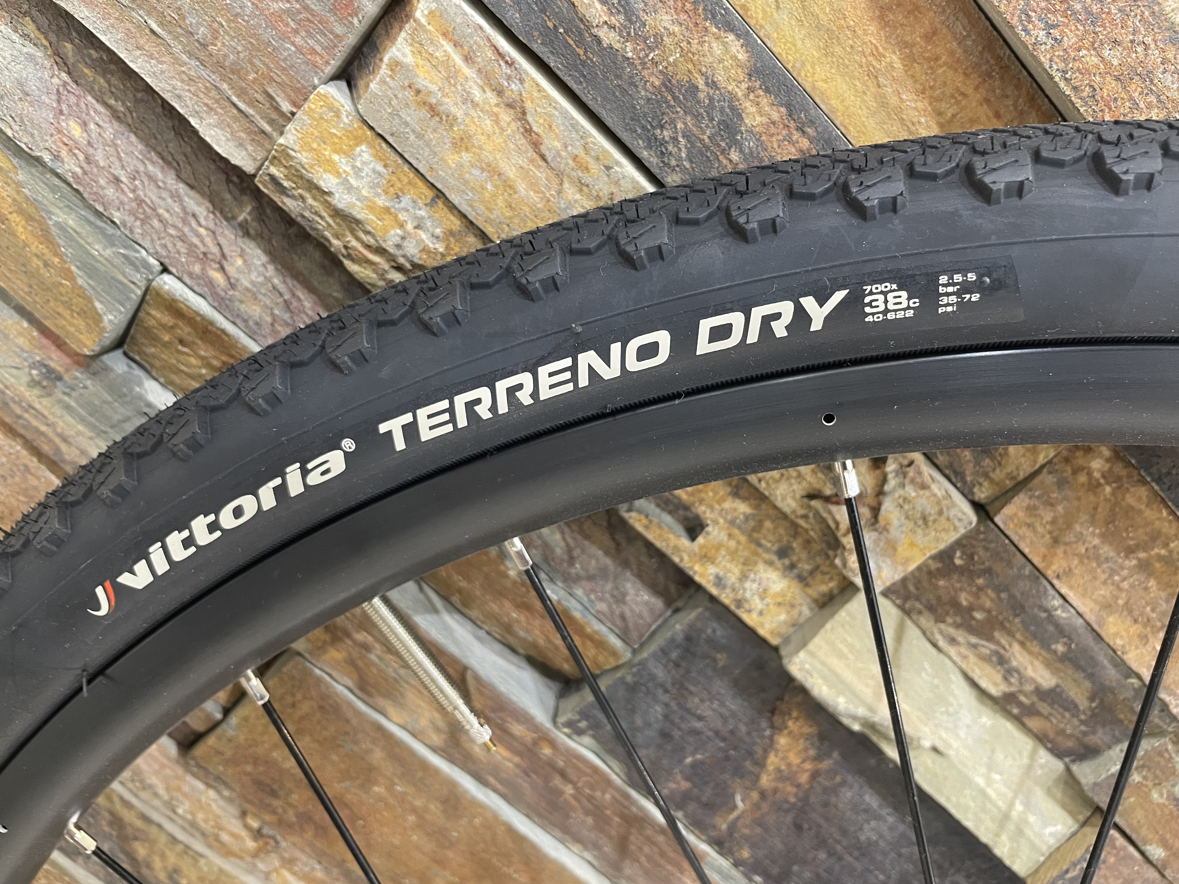 タイヤはvittoria製の38cを装着。走破性・快適性ともに高くなっています。フレームのクリアランスが広いので、もっと太いタイヤにも交換できますよ!