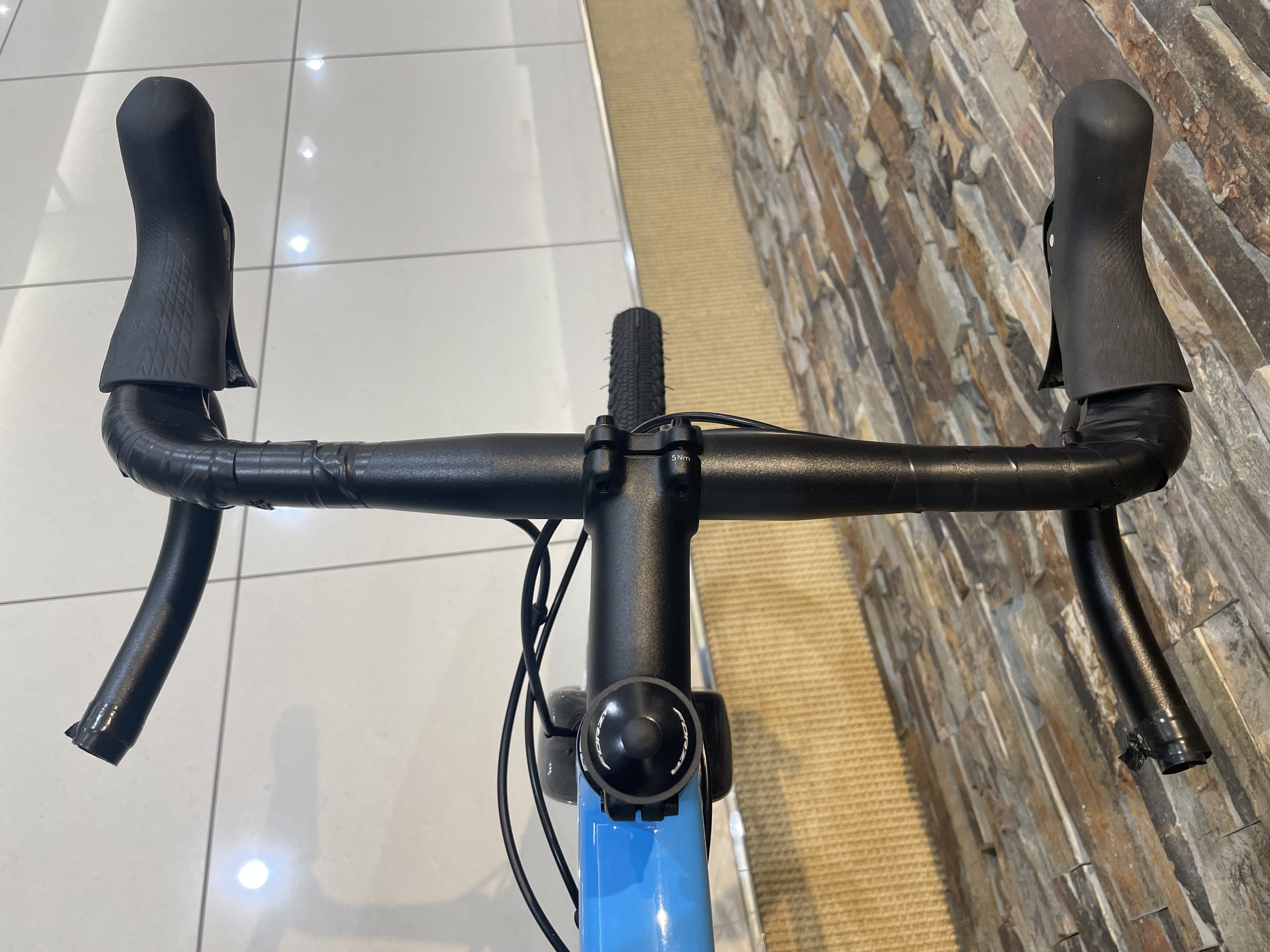 グラベルロードらしくフレアハンドルを採用。未舗装路で抜群の安定感を誇ります。