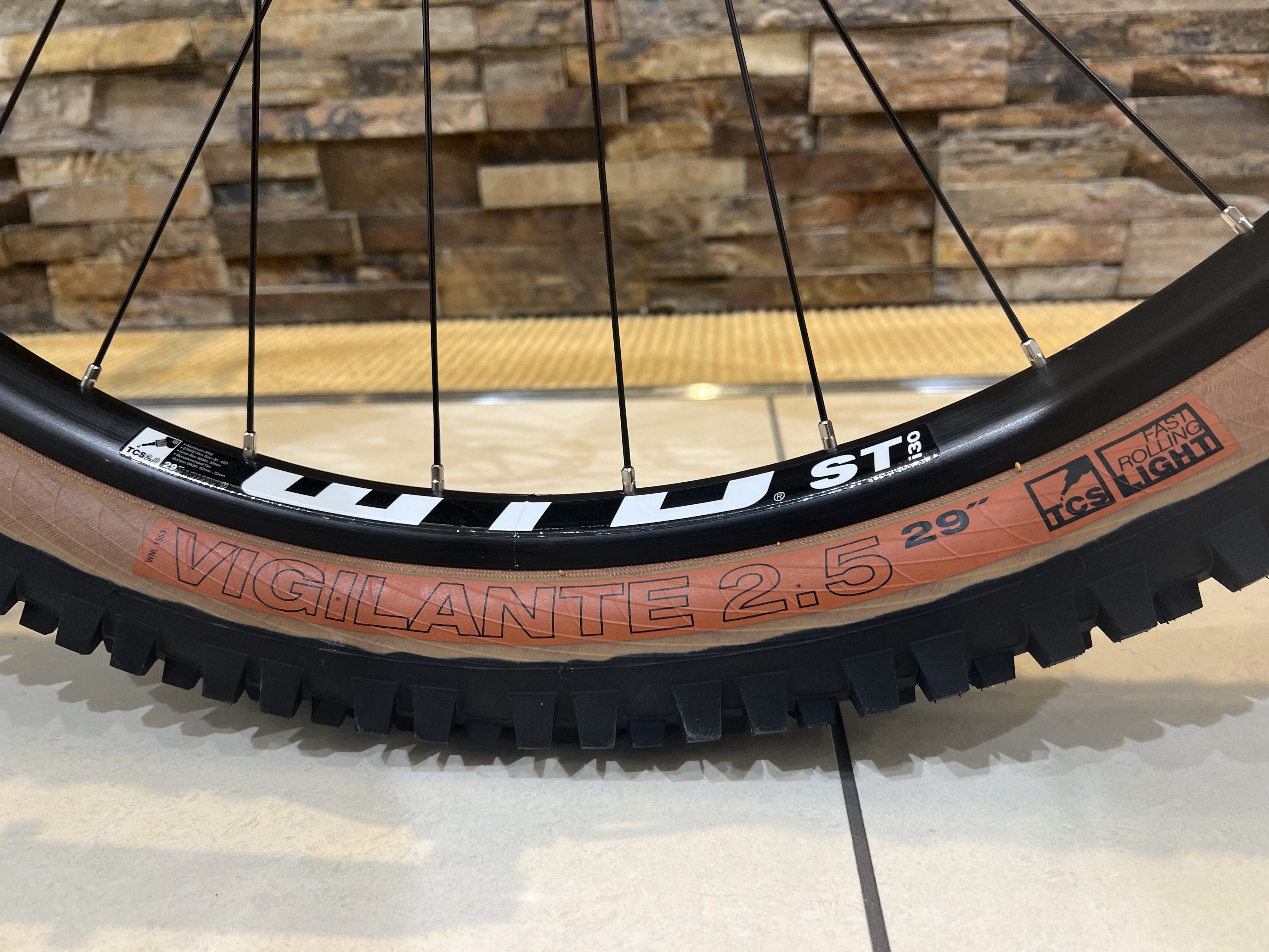 タイヤはWTB Vigilante TCS 29 x 2.5 を前後に装備したトレイルバイクで極太タイヤが迫力満点!!ガチオフロードも難なく行けるタイヤでトレイルライドを楽しんで下さい!!