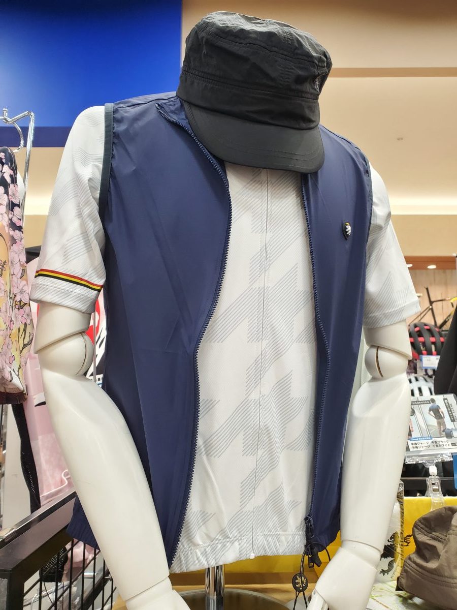 マネキンには着せていないですが、今の時期なら15℃前後の長袖インナーにジレを羽織るくらいが丁度いいかなと思います。寒がりさんや山岳を攻める方はウィンドブレーカーを羽織るのもあり。