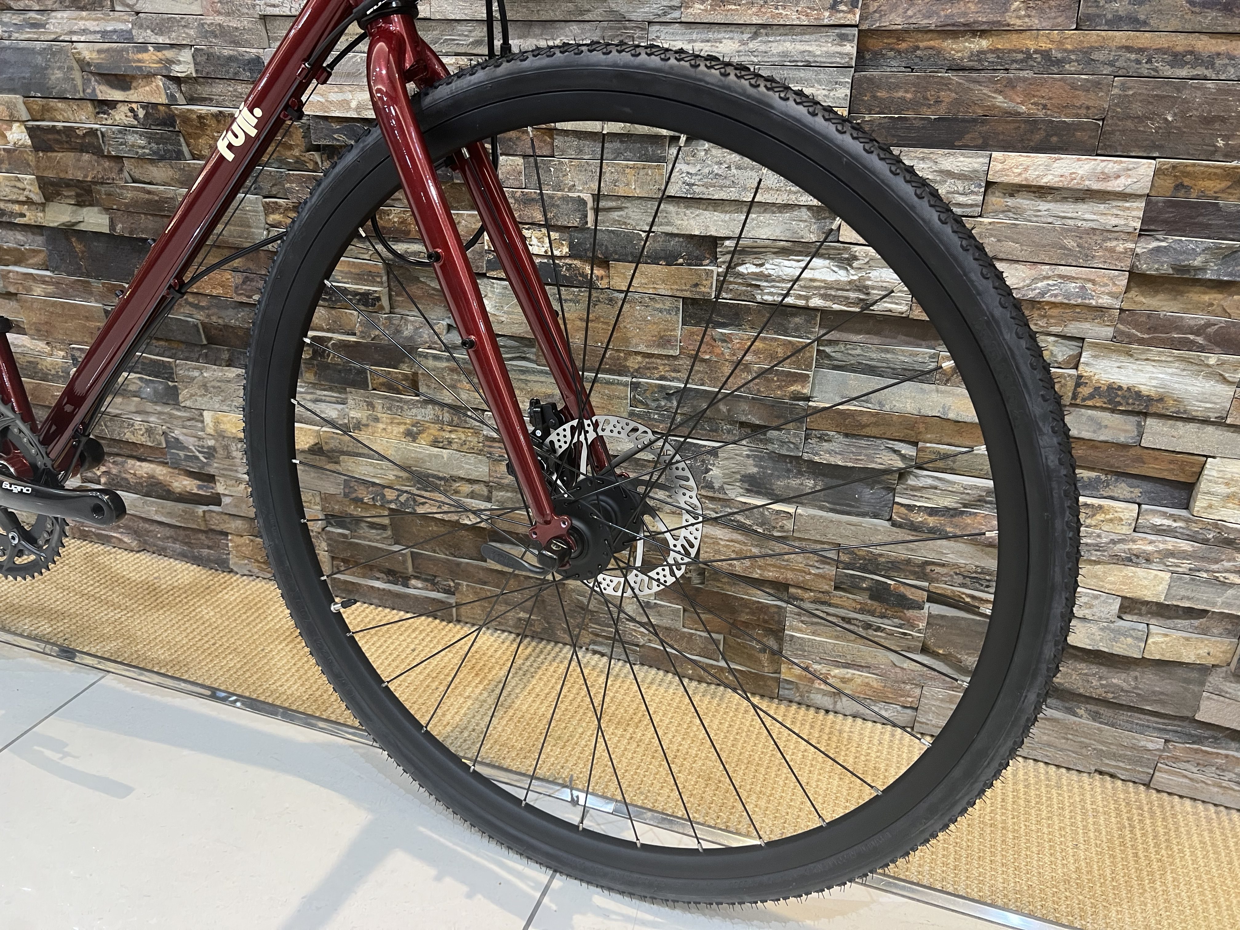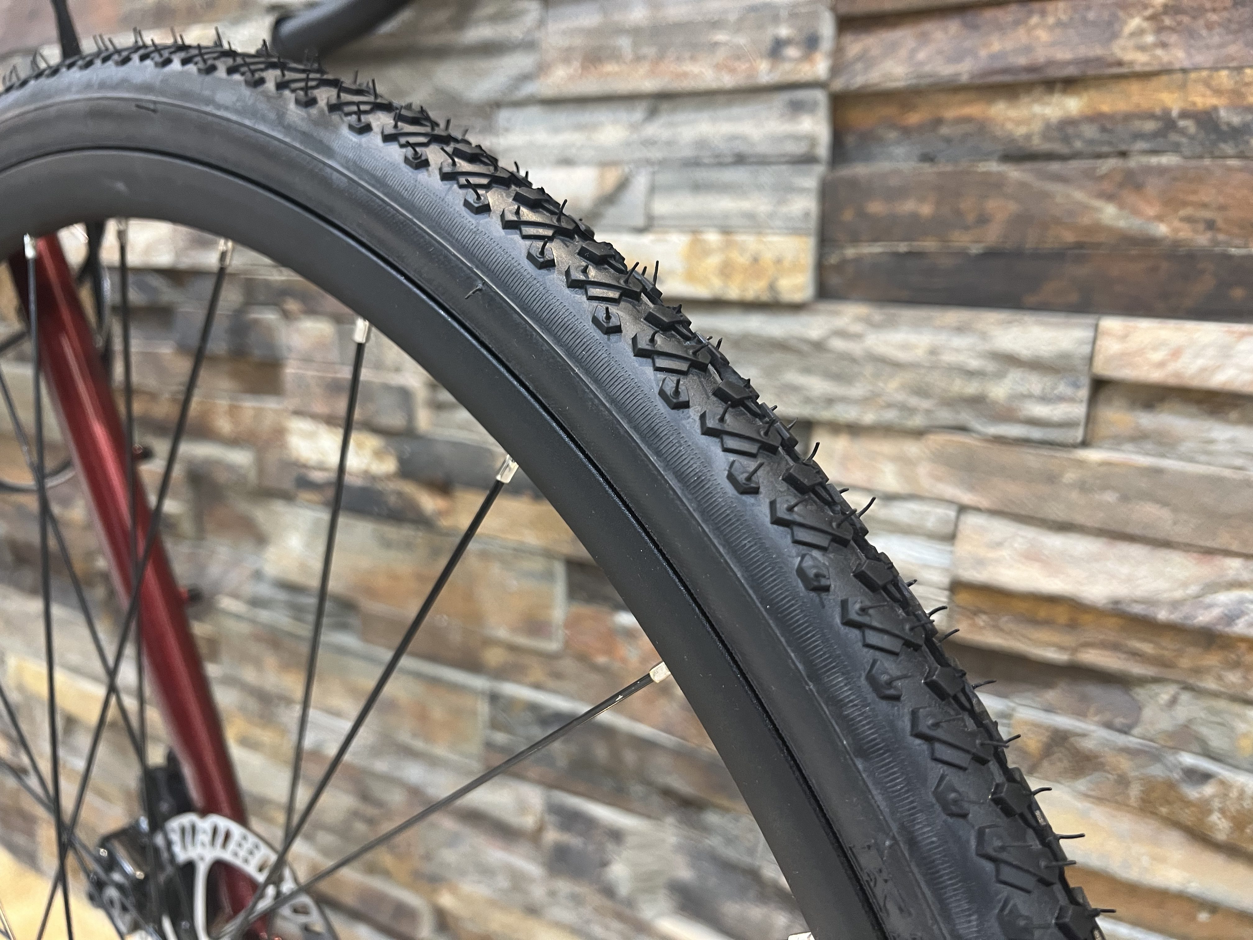 ブレーキはディスクブレーキ搭載であらゆる路面で制動力を発揮します。ワイヤー式のためメンテナンスもしやすいですね。タイヤはKENDAの700×35Cタイヤを装備。太すぎず細すぎずマルチな使い方には丁度いいサイズ感です。またセミブロックタイヤが、コーナリングの際グリップ力を発揮しますので、操作しやすいです。