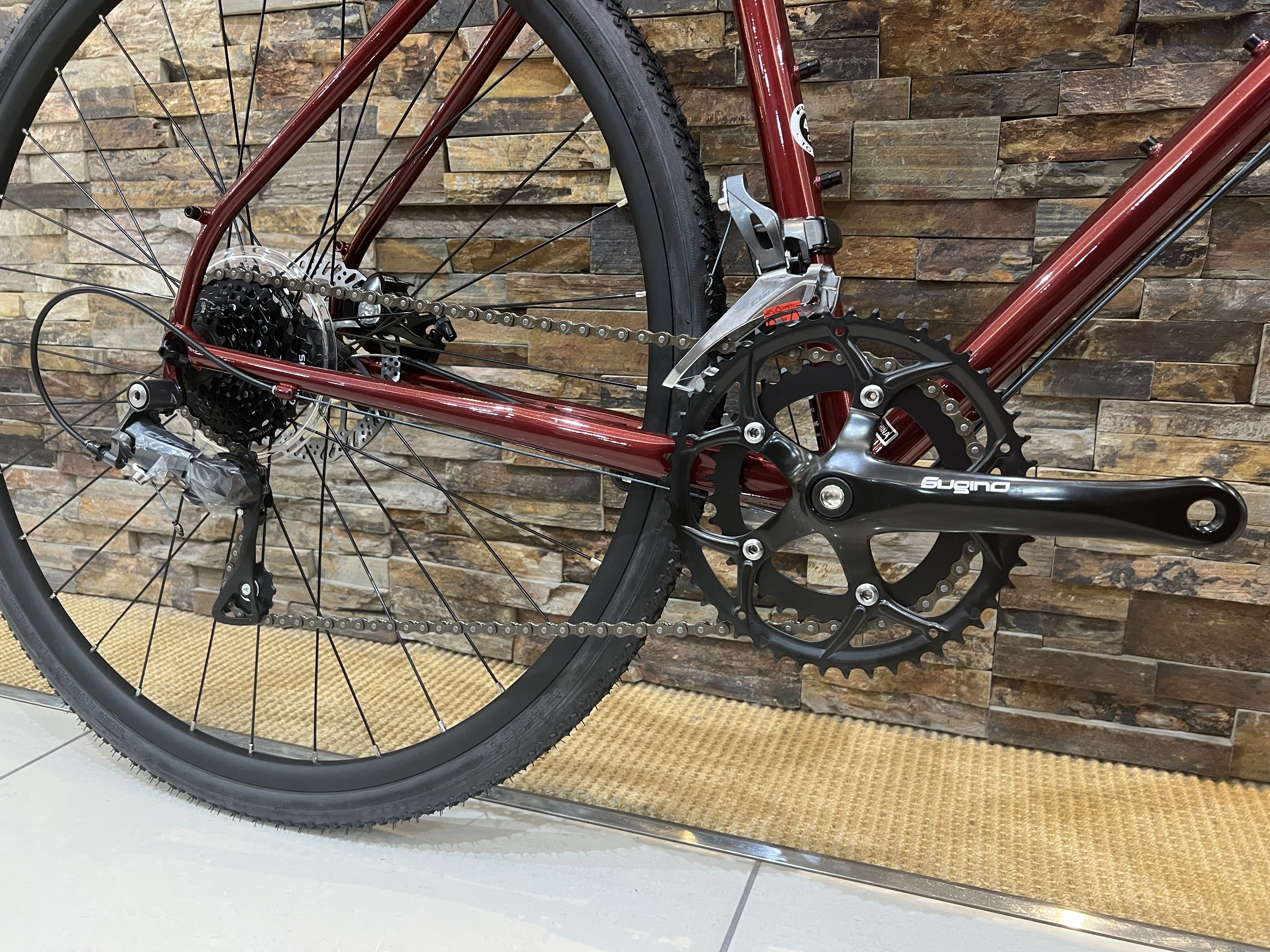 コンポーネントはシマノClarisをベースに、クランクはSUGINOクランク搭載。コンポーネントに関しては、安心安全のシマノで街乗りには全然OK。ロングライドなどでの使用などを考えると少し心もとないかも。コンポーネントやブレーキなどをアップグレードする事によって総重量も軽くなり、より軽い走りにも対応可能です。もちろん、街乗り快適号として使用する場合キャリアの搭載などもご検討いただいていいかもしれません。