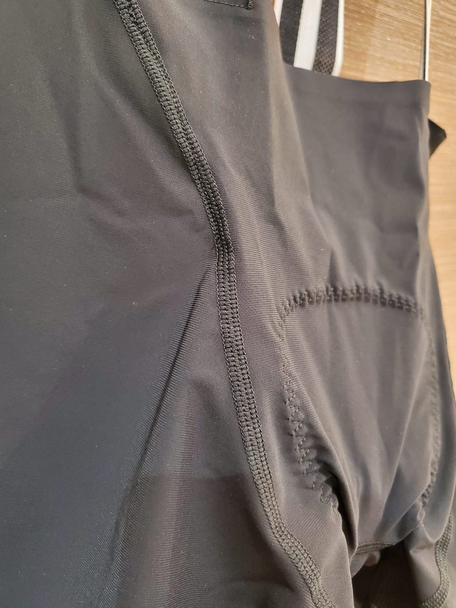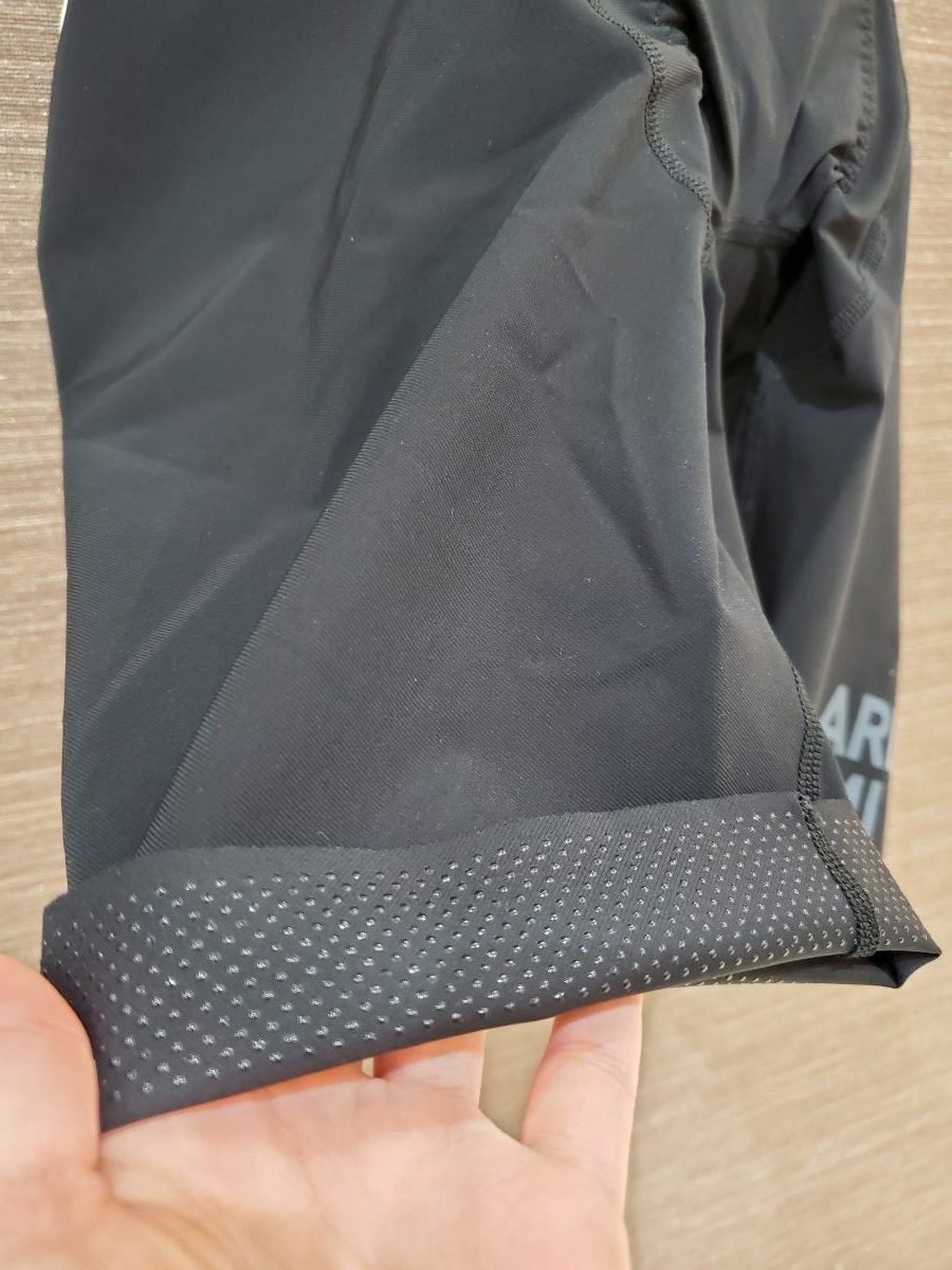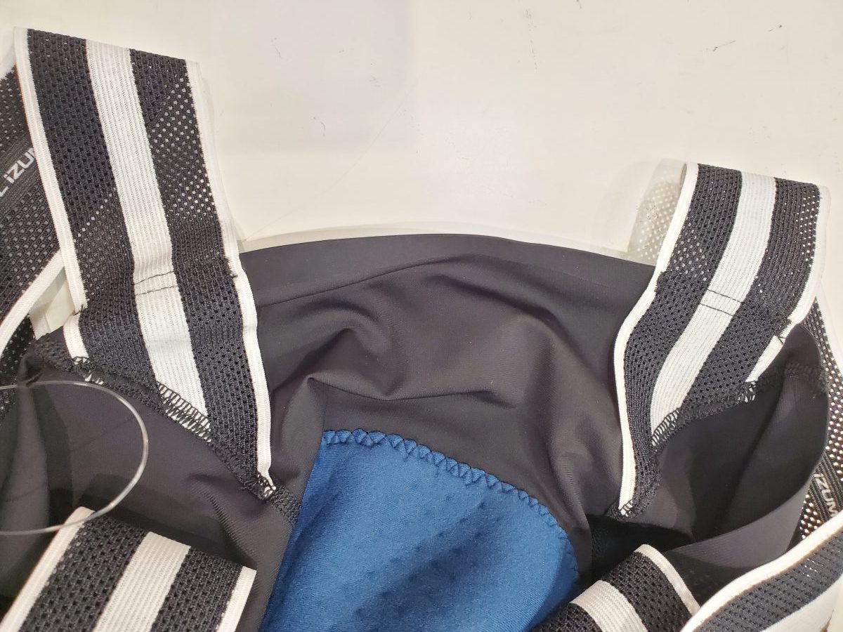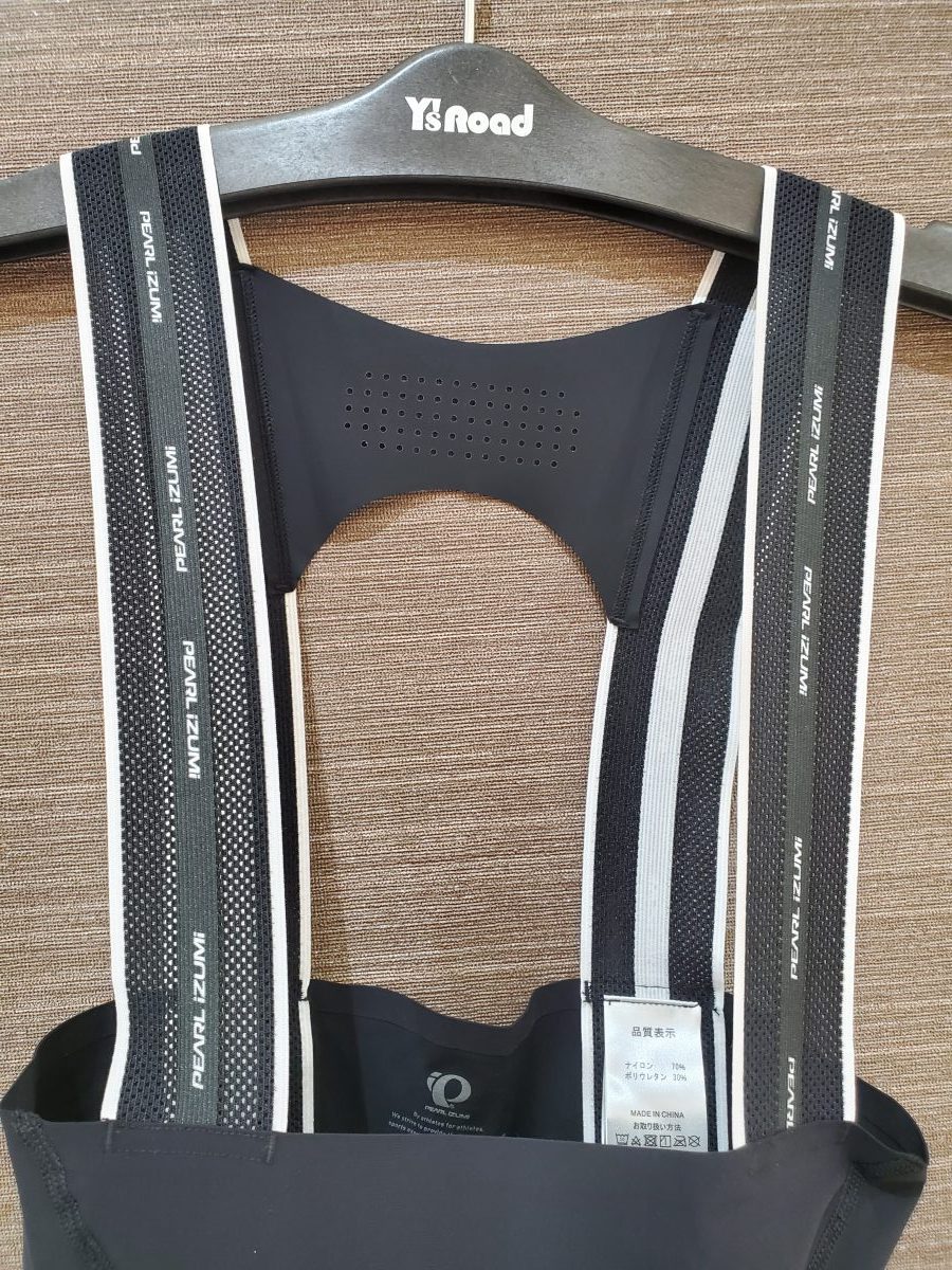 この縫い付け位置を従来のモデルと比べパッド近くまで延長することにより、着用した際パッドを上へ引き上げフィット感を高める特殊ビブ付設計