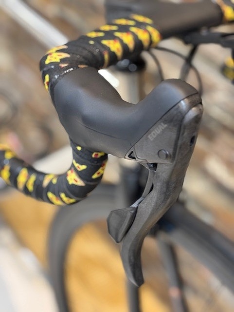 バーテープは「PDW Wraps バーテープwithシリコングリップ」を巻きました。見た目の布感とピザの絵が可愛さを醸し出してるので良いんじゃないかって事で使ったんですけど、いざ巻いてみるとクッション性があって握りやすく、テープの両側にシリコンのラインが通っていて、握った時の手のズレを抑えたり、バーテープを重ねてズレにくくするのにも一役買ってます。見た目で侮る事なかれ。オススメです。