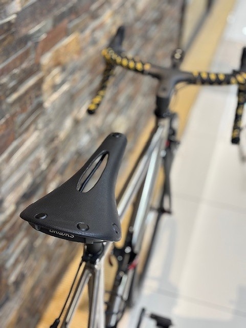 サドルが「BROOKS CAMBIUM C15CARVED」を使用。シートポストは見えにくいですが「One by Esu カーボンアキレスシートポスト」となっております。見た目と乗り心地と軽量化を考えての構成です。やっぱりスマートなチタンにBROOKSは似合いますね!