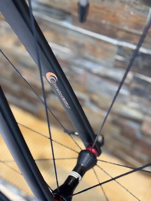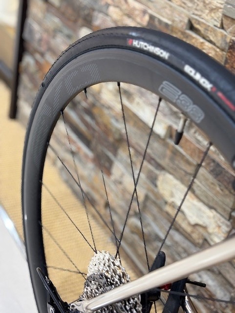 ホイールはお客様が持ってこられた「EVO E38」。38mmのリムハイトとカーボンのマットブラックがスマートなチタンパイプによく似合う!!