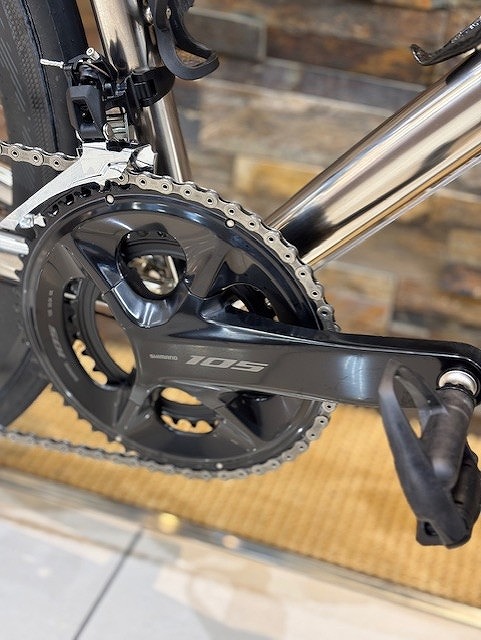 コンポは「SHIMANO 105 R7100」ですね。12速の105です。50-34Tと11-34Tで登坂もなんのその!鉄フレームにお似合いのギア比なんて勝手に思っちゃいますがどうでしょうか。