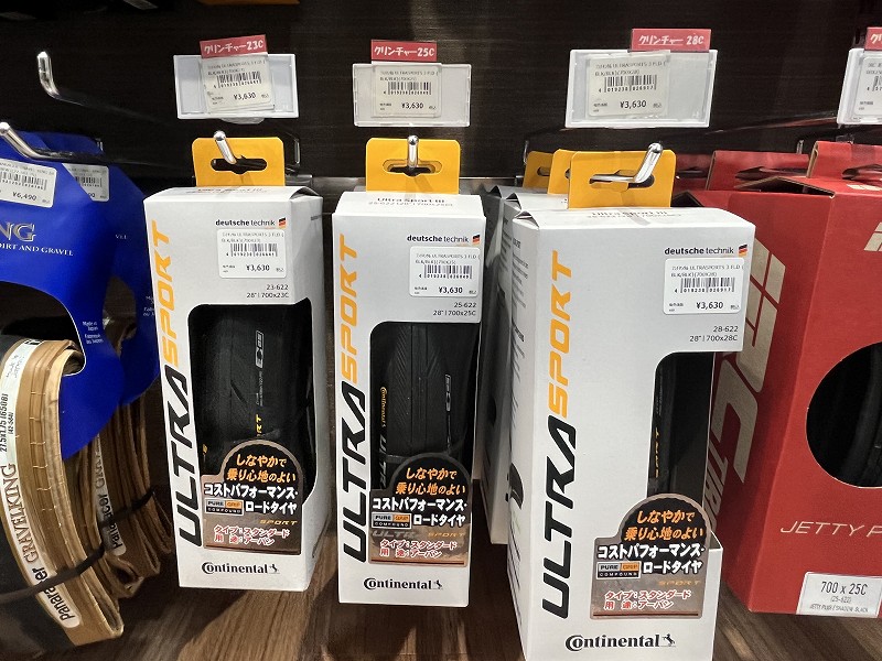 現在広島店では23C,25C,28Cの全サイズをご用意しています。店頭でのタイヤおよびチューブ交換も承っているので、お気軽にスタッフにお申し付けください!ご来店お待ちしております。