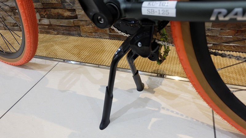広島店店頭展示のコンセプトモデルも装備しておりますが、通常のシングルレッグのセンタースタンドに比べ左右の揺さぶりに強く安定感抜群のスタンドとなっています。また、重くなると安定性が増すので、クロモリフレームモデルやフロントバスケット・リアキャリアー等オプションの増設と相性が良いです。