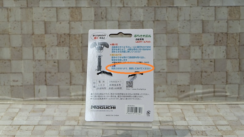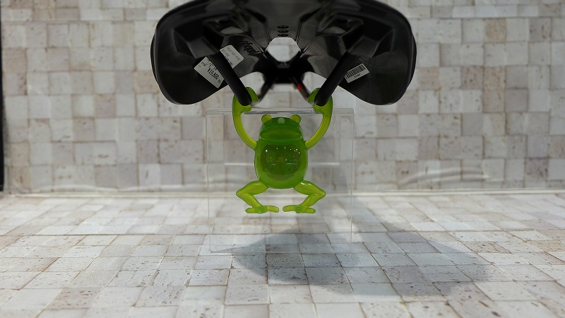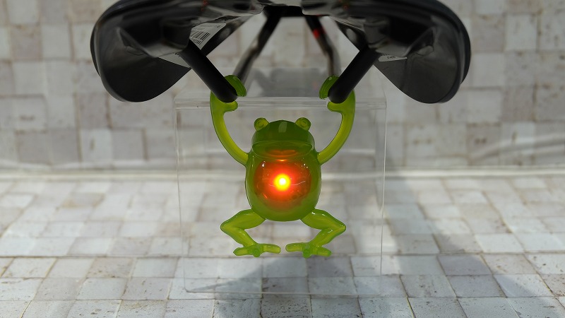 装着時は画像の様にカエル君にサドルレールを掴んでもらいます。…ポーズのせいかカエル君が楽しそうですね。えー、ライトはカエル君の背中を押さえながらお腹を押すと点灯します。