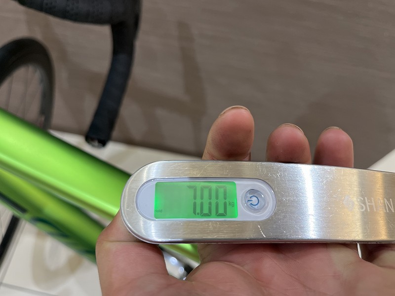 重量はLサイズでジャスト7㎏(実測、ペダル込)、ペダルはエントリーモデルのSPD-SLで、チューブレスタイヤにブチルチューブを入れてこの重量でしたので、軽量タイヤ、TPUチューブにすれば6.8kgくらいになると思います!