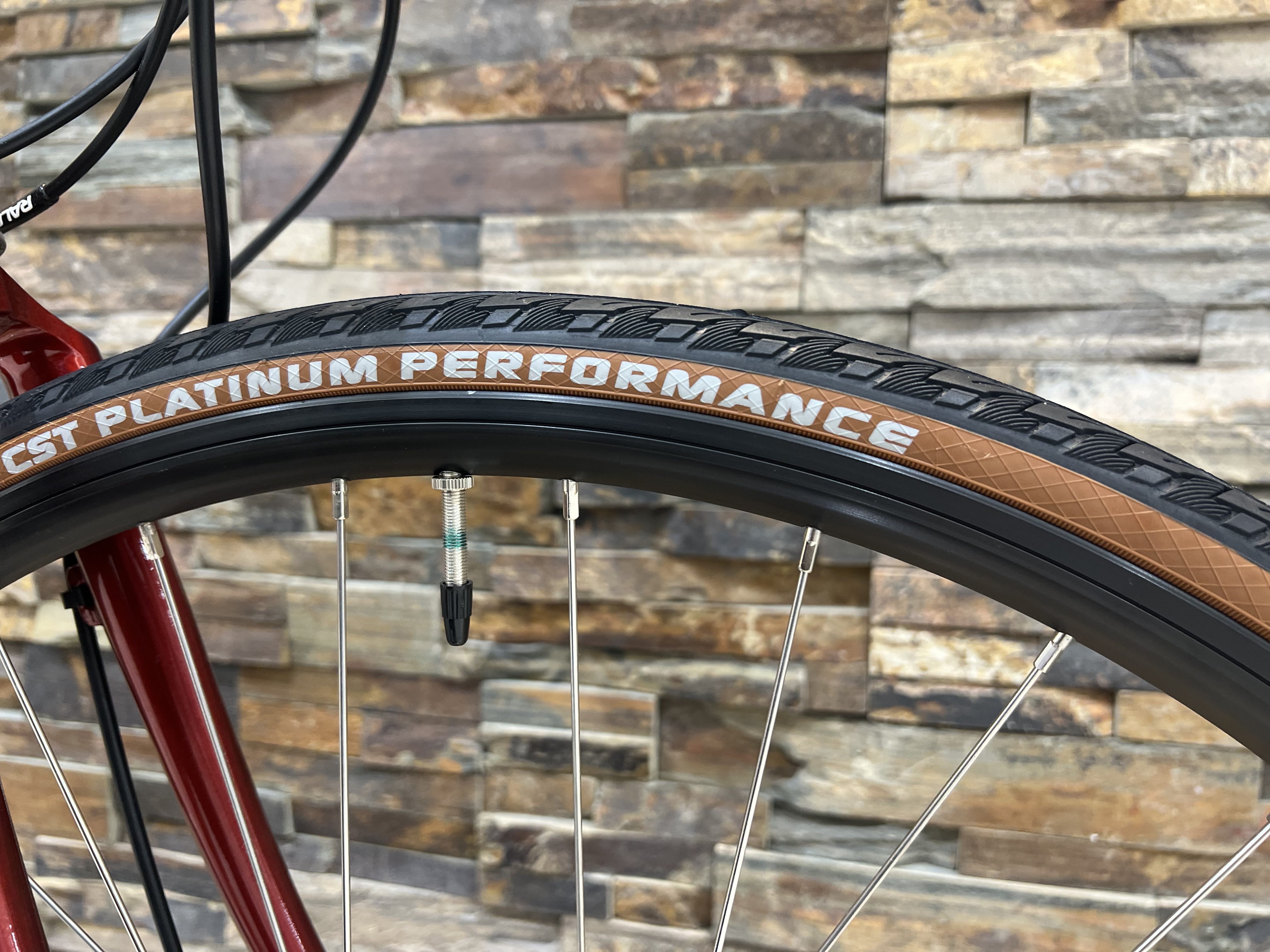 タイヤは、700×28Cを装着。昨今ではクロスバイクは32C~と太いタイヤが多いです。しかしながら今回のバイクは28cで細く、走りやすさ爽快感を感じさせる走りとなっております。