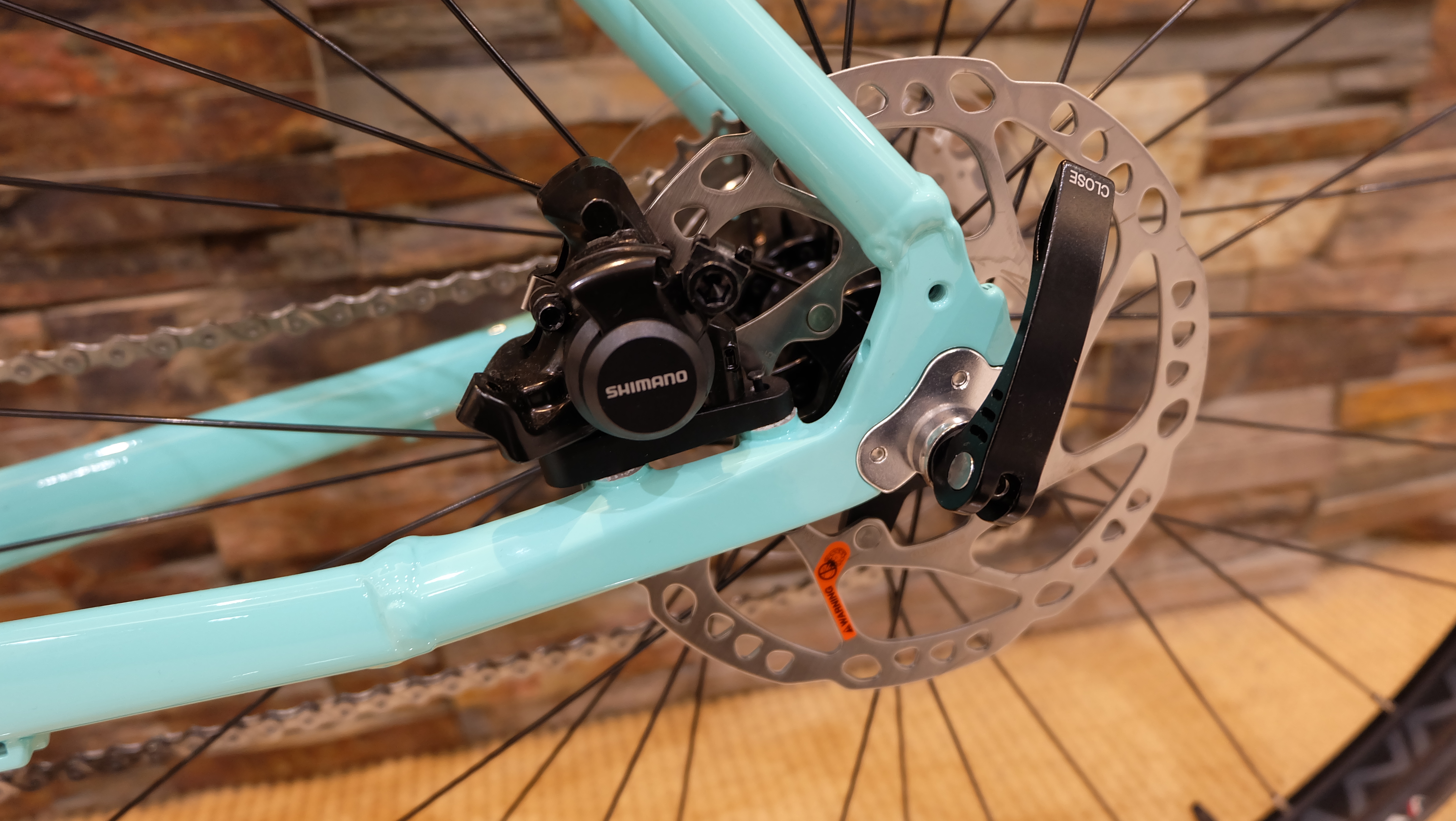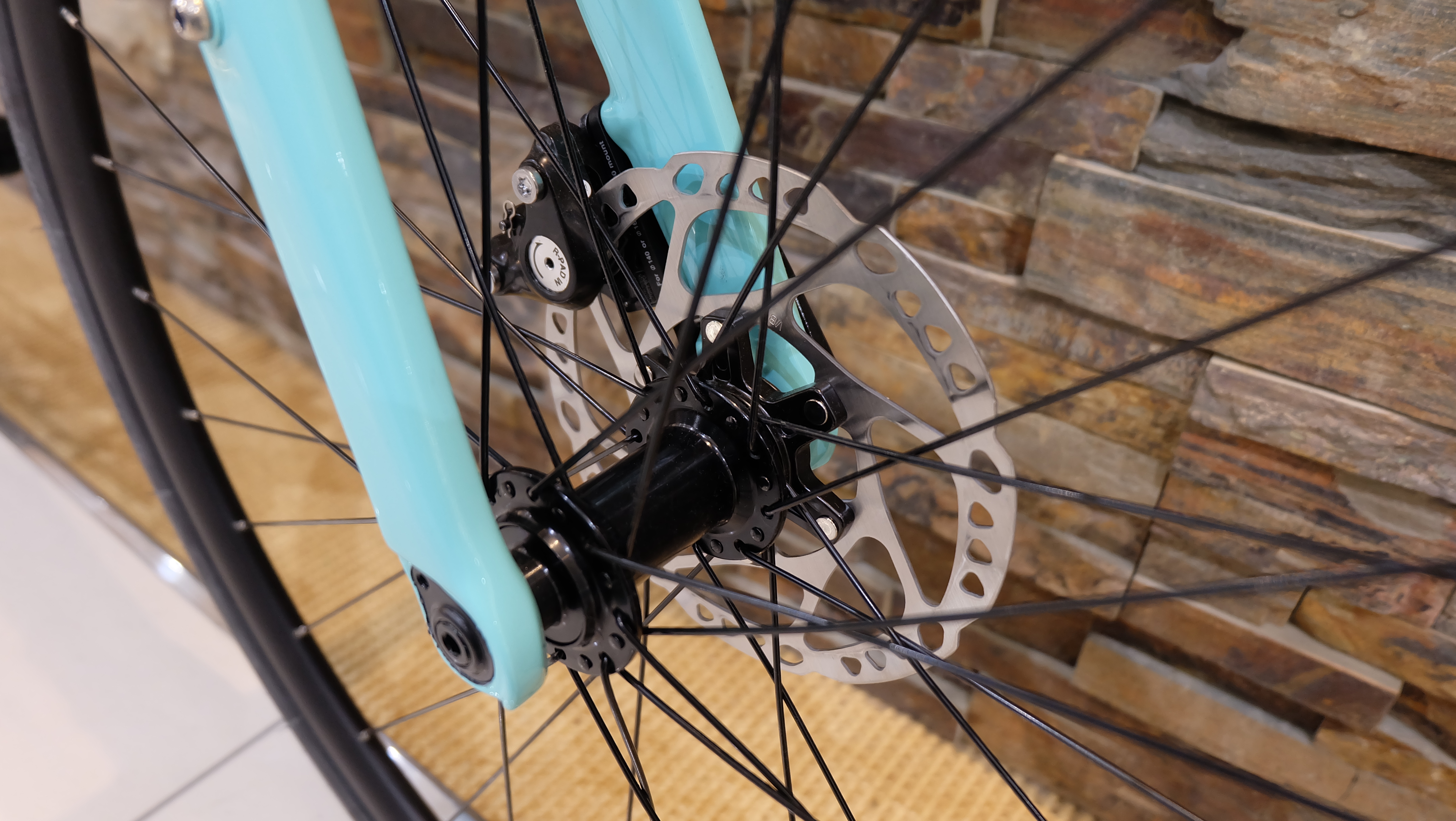 軽量アルミフレームにカーボンフォーク採用とバランスの取れた仕様になっています。今回採用されている機械式ディスクブレーキは、油圧ブレーキには劣るかもしれませんがリムブレーキと比べると段違いに制動力がアップしており軽い力でブレーキをかけることができます。さらに雨の日でもしっかりとブレーキが効くので安心して乗ることができます。