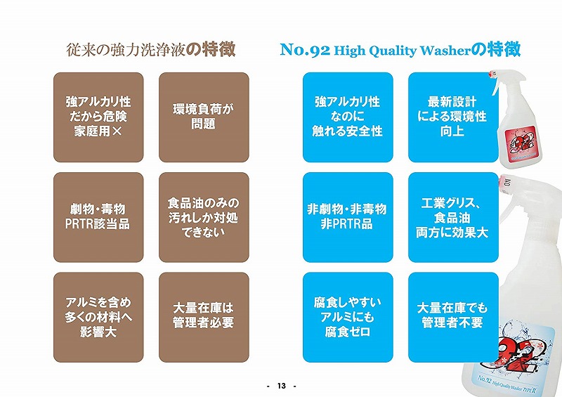 この『No.92』はアルカリ性洗剤ながら樹脂や金属に対する攻撃性が低いのが売り。
