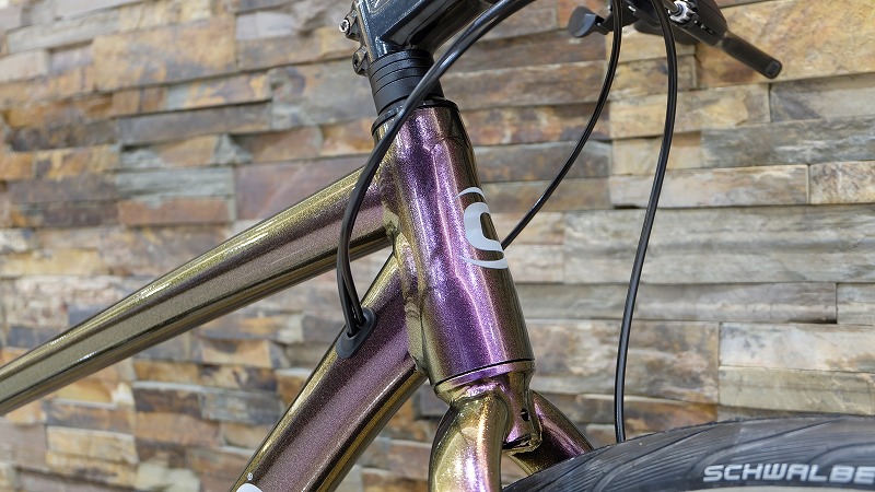 長めのヘッドチューブによりハンドリングがし易い他、乗って漕ぎ出した際の安定性の良さもミソです。