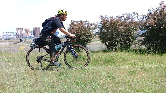 やっぱりロードバイクみたいなスピード感は無いですよね。グラベルロードなんですし。あの荷物担いで大体時速20kmいかない位のペースで走ってました。頑張って25kmとか?ハンドル以外カスタムしてないんでホイール変えたりすると違うんでしょうけども。当然ながらオフロードはめちゃめちゃ楽しかったですよ!川土手の未舗装の道とかを走り回ったのですが、砂地だろうが轍だろうが草生やそうが関係ないですね。45cのふっといタイヤと「KingPin」のおかげでシッカリと衝撃を吸収してくれます。