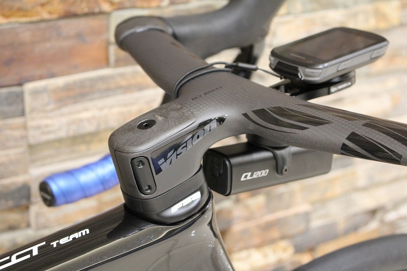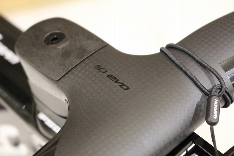 もともと専用形状のアルミステムとONE BY ESUのJカーボンハンドルバーが付属します。ただ、ステム長がお体に合っていなかったため、ポジション調整と軽量化を兼ねてVISION METRON 5D EVOハンドルバーを取り付けました。ステム長80㎜、ハンドル幅380㎜のコンパクトなサイズです。