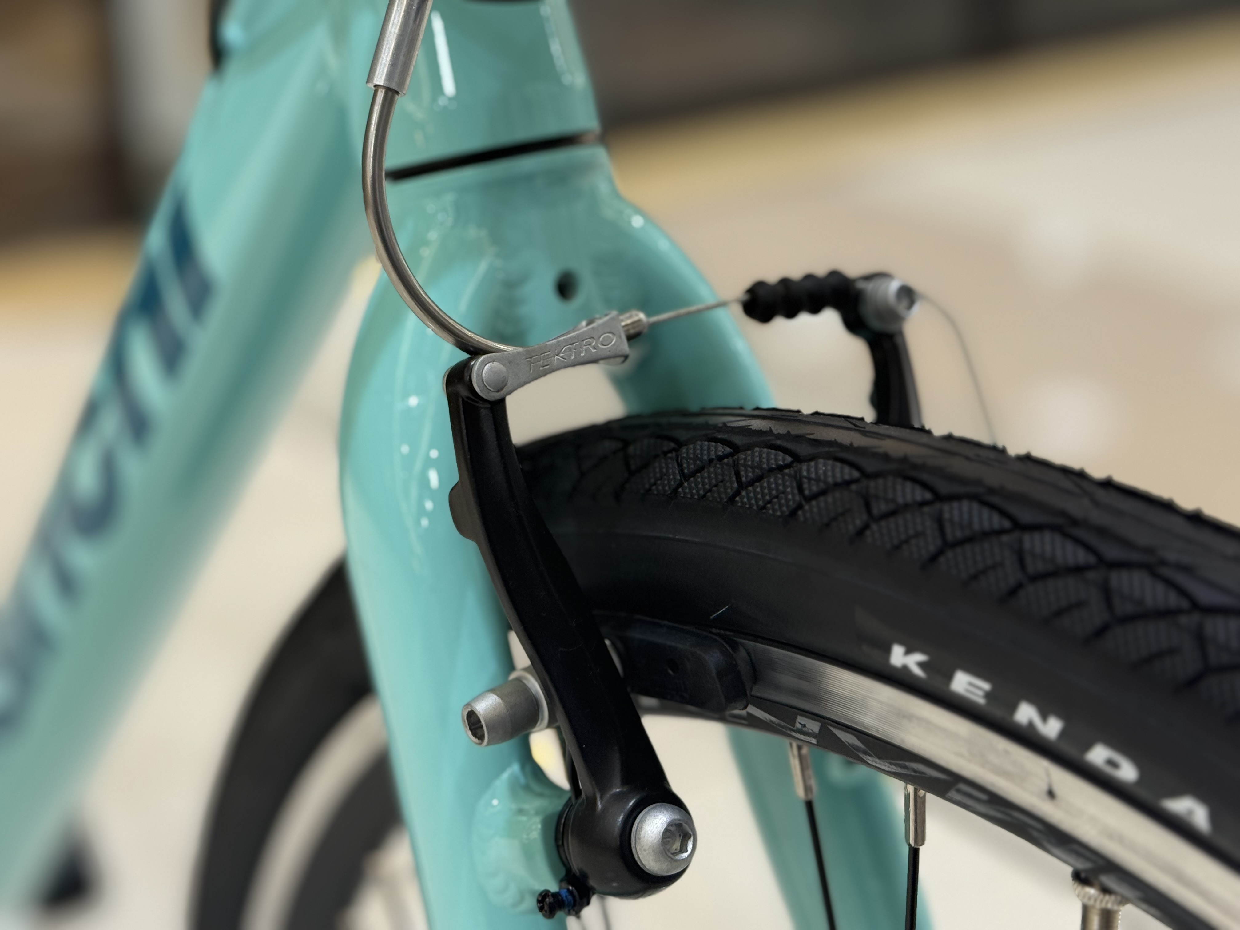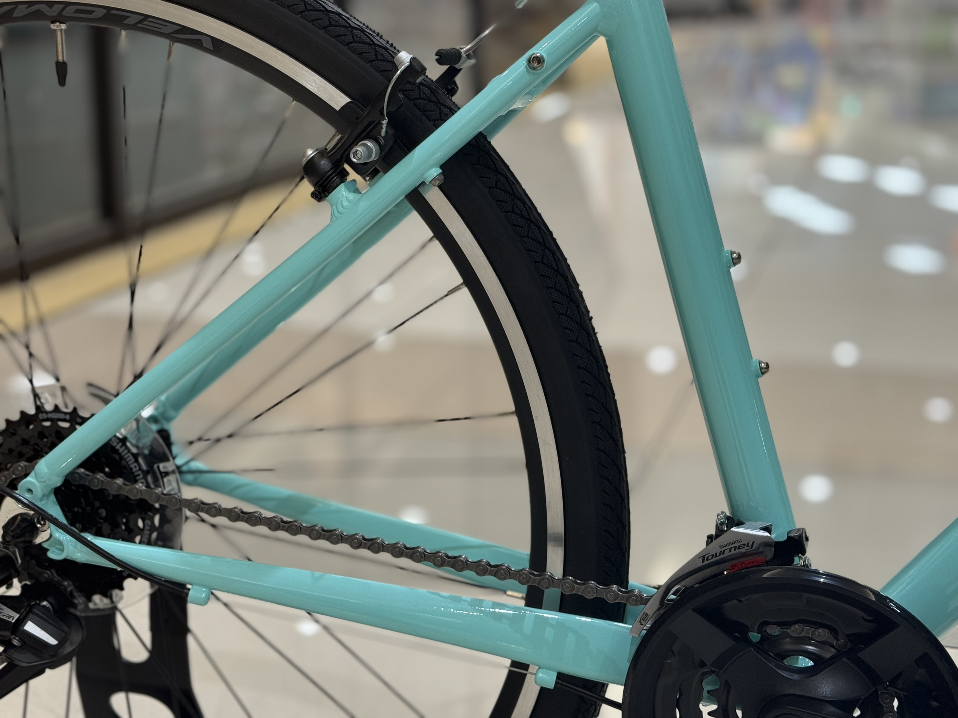 スポーツバイク愛好者は知らない人はいないのではないかというくらい有名なイタリアの自転車ブランド「BIANCHI」。ビアンキの象徴的なカラーであるチェレステ(イタリア語で「空色」の意味)は、女王の瞳の色が由来とも言われています。色合いがかなりポップなため男女共に広島店でも大変人気のあるクロスバイクになっております。CSPORTのジオンメトリでは、過度な前傾姿勢にならないアップライトなハンドル周りの設定によるコントロール性能と走行性能のバランスが取れた設計で丁度いいジオンメトリになっております。フレームはアルミフレームで日常使いを目的とするライダーの為軽量かつ頑丈に設計。車体重量は約11kg(サイズによりやや変動有)