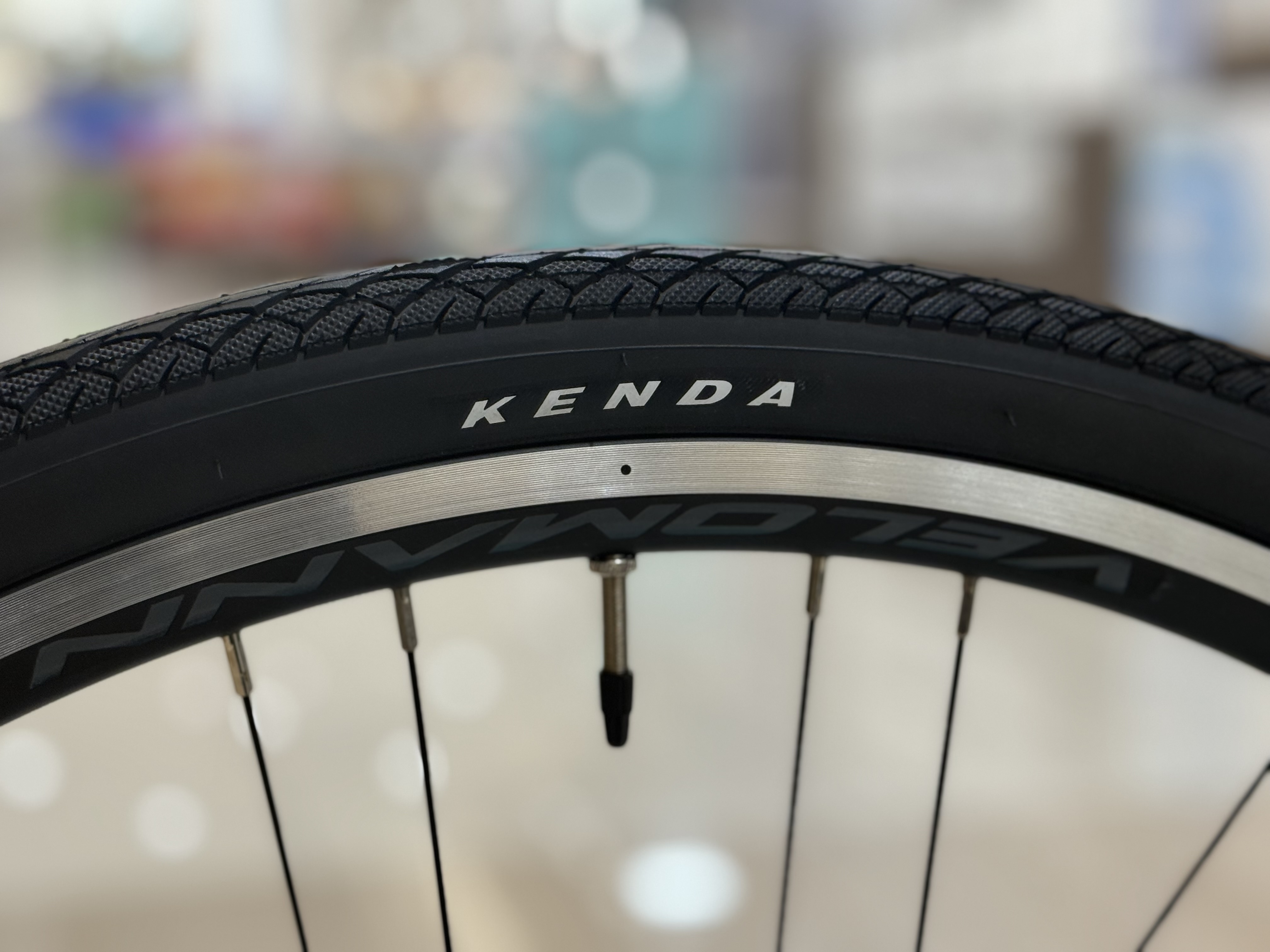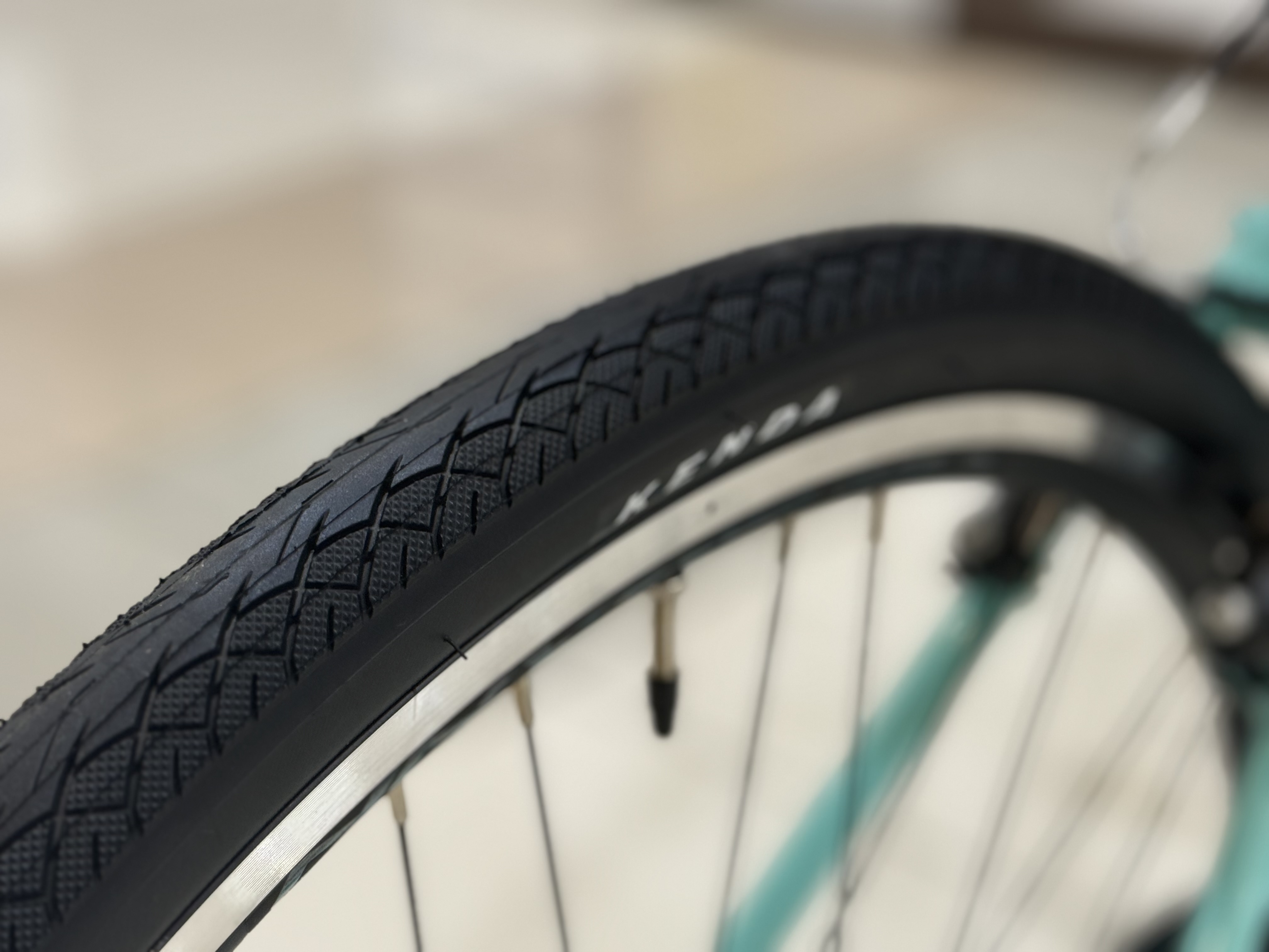 タイヤは、KENDAの700×38cが採用。街乗りを想定して一般車より少し太くし安定感を優先。タイヤが太いと乗り心地が良いはもちろんですが、パンクも細いタイヤに比べるとリスクは軽減出来ます。