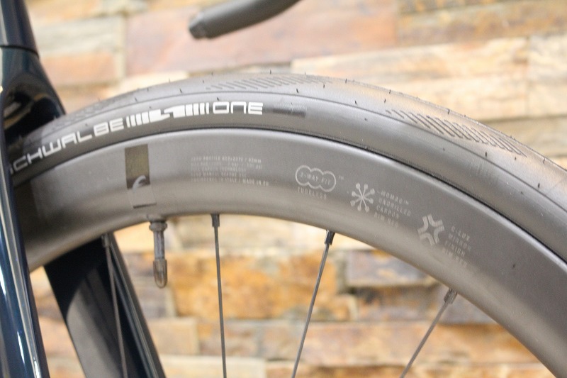 タイヤは32Cクリンチャーを装備しています。内幅23㎜のホイールなので実測はもう少し太くなるでしょうか。