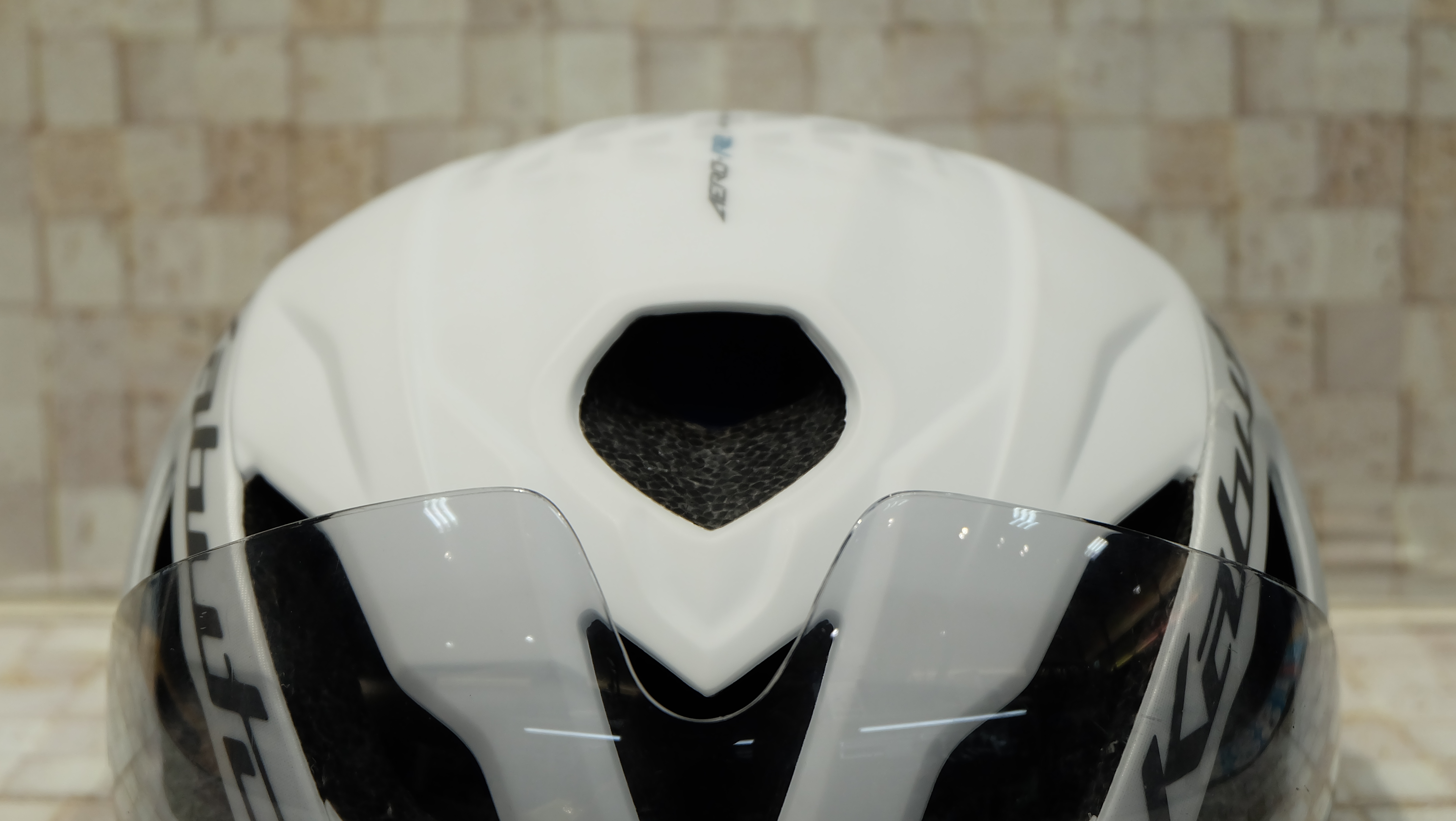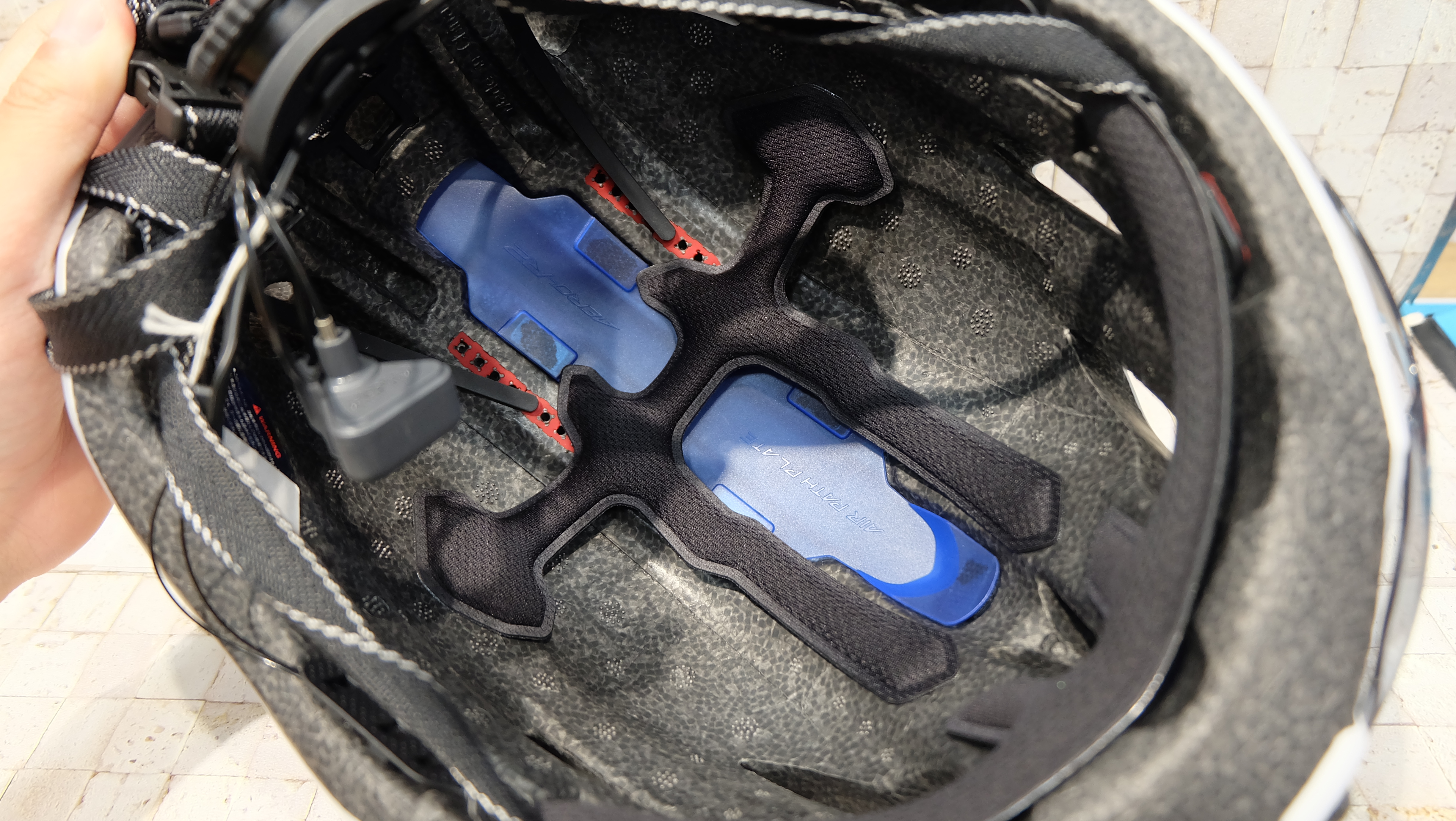 ヘルメットの中央部分に通気口があります。この通気口とヘルメット内部にあるエアプレートでエアトンネル構造を創り出しています。整流効果があり空力性能を安定させる機能を果たしています。さらに取り外し可能な為、暑い時などはエアプレートを外すとより空気が入ってき、涼しくなる効果もあります。
