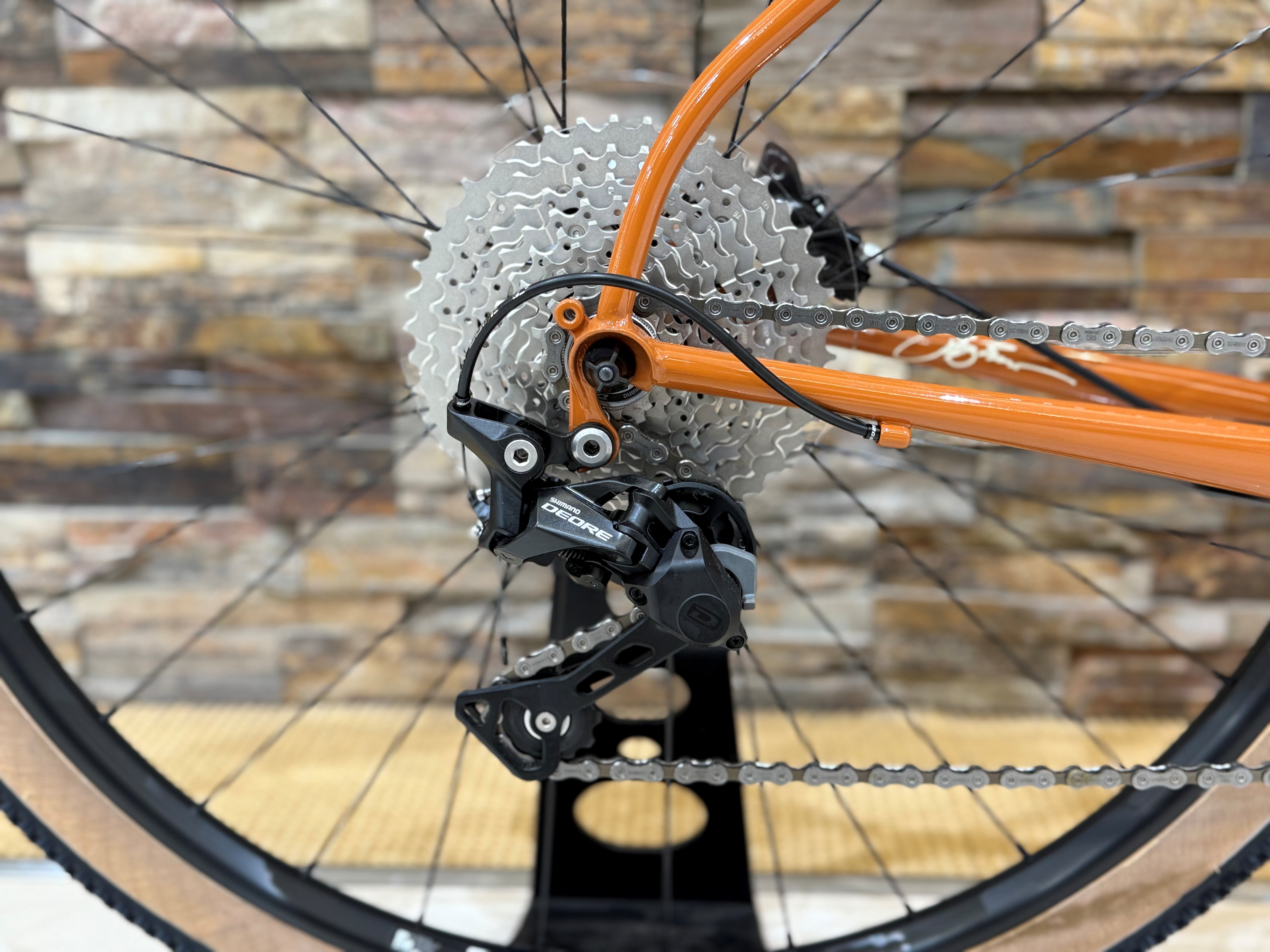 フレーム、フォーク共にダブルバテッド加工によるクロモリチューブで構成されとにかく頑丈で素材特有のしなりがあり振動吸収性も上がります。タフさを求められるアドベンチャーバイクならではのマッドガード/ラックマウントの他5つのボトルケージ台座を装備されており積載力も長けております。 街乗りはもちろんバイクパッキング可能で幅広いシチュエーションで活躍してくれる一台になります。
