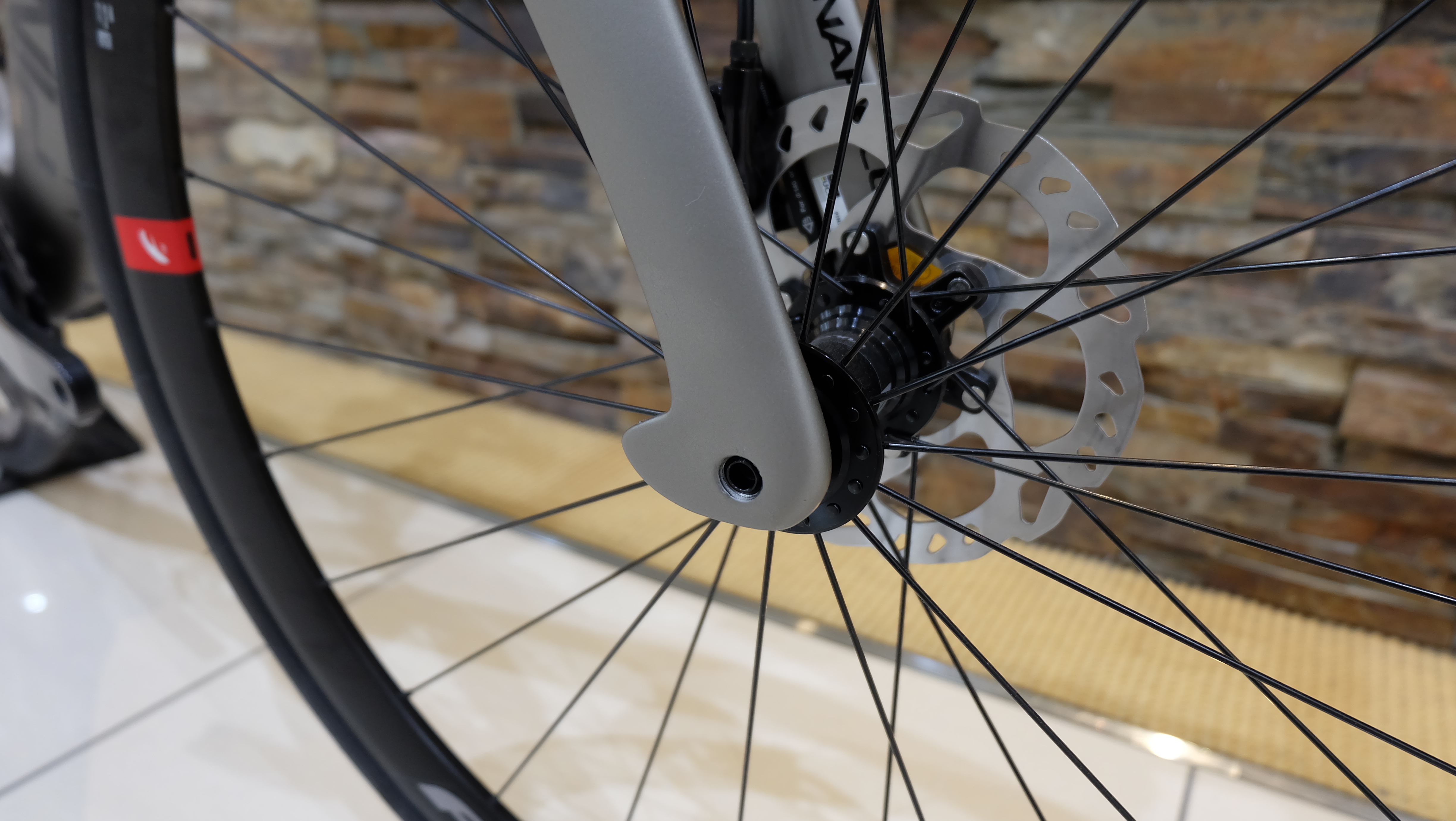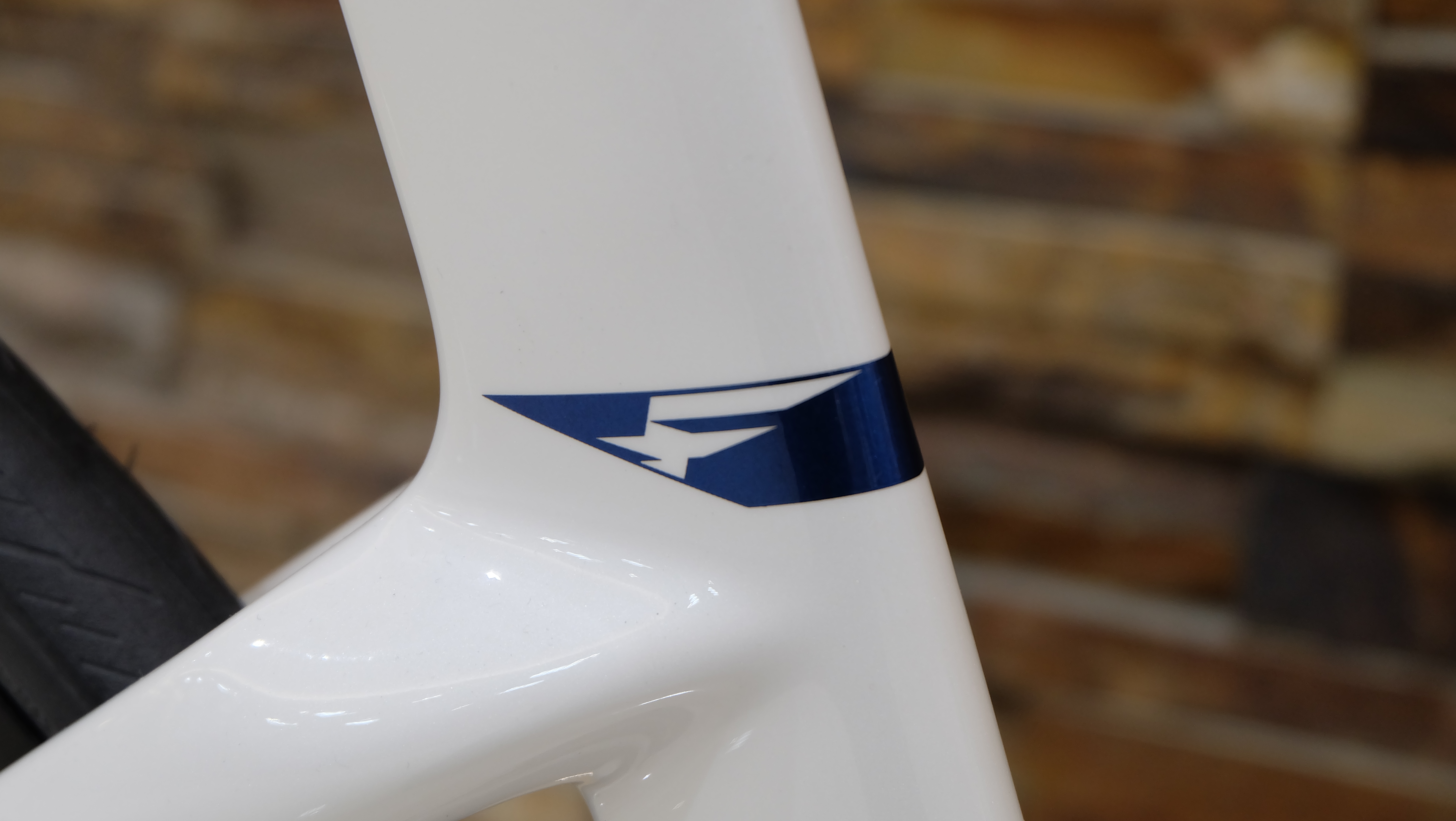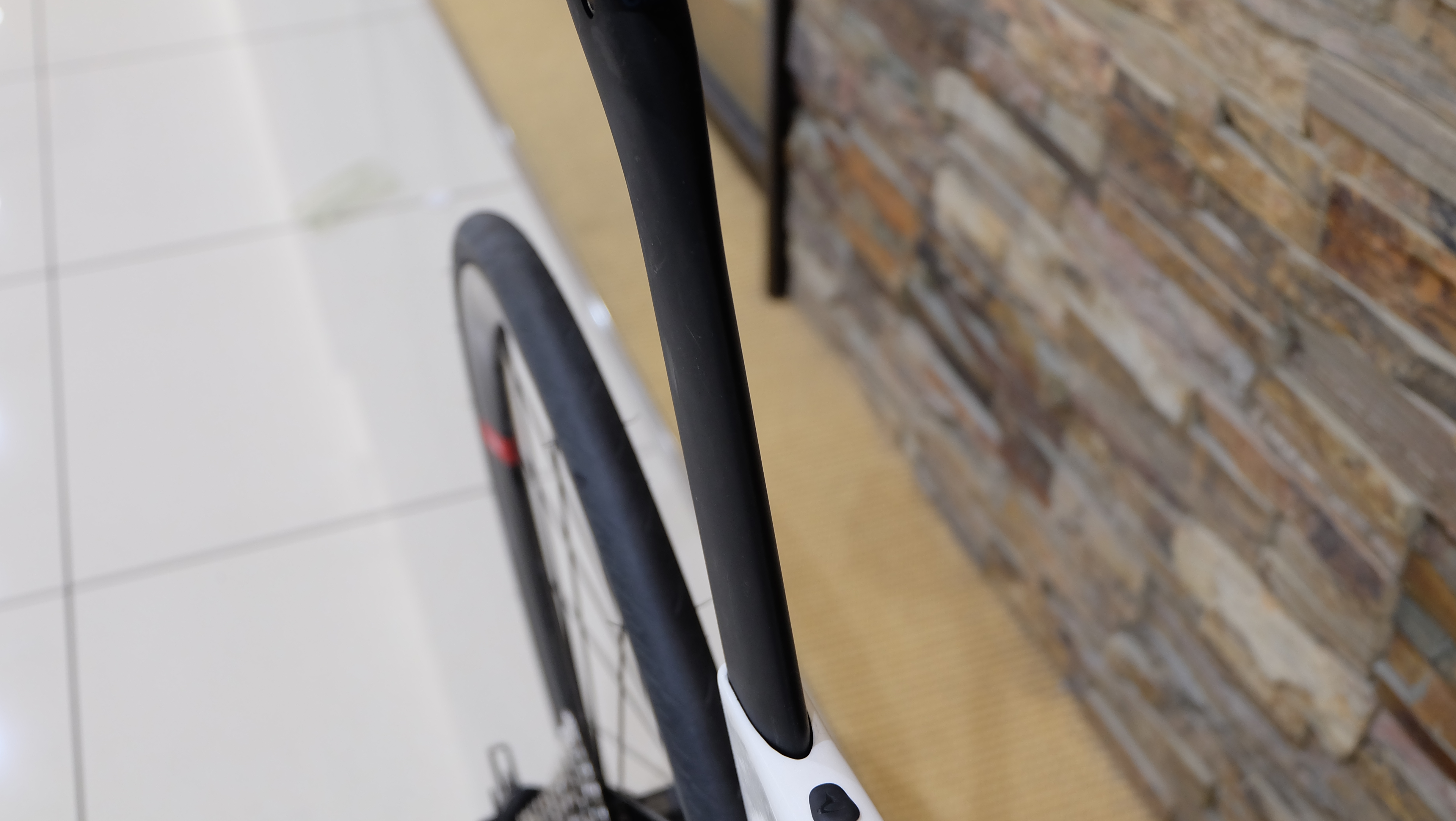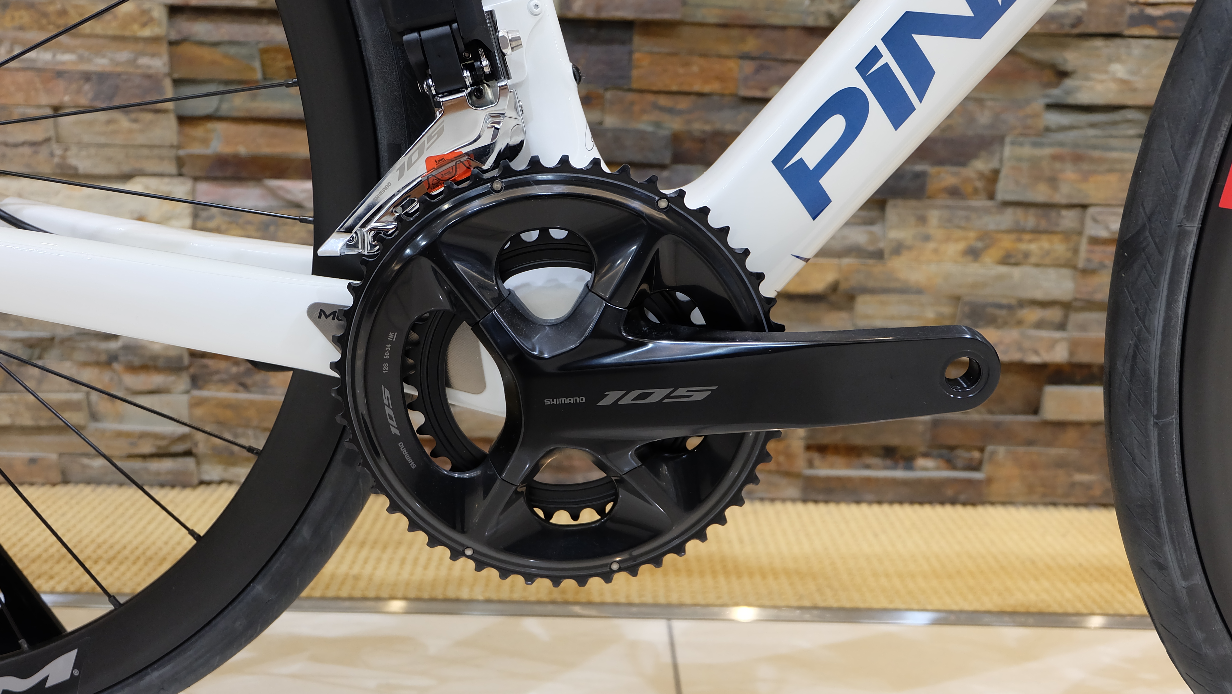 コンポにはシマノ105Di2を装備しています。電動コンポならではの素早い変速性能に加えて、ヒルクライム中のトルクをかけた状態でもしっかりと変速してくれるなどこのバイクにピッタリとなっています。