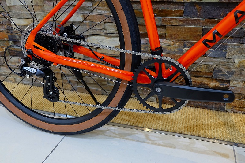 フロントはメカニカルトラブルを最小限に抑えることが出来るフロントシングル仕様。前1速×後8速です。特にこちらの自転車の特徴はナローワイドのチェーンリングとチェーンウォッチャーが装備されています。その為トラブル防止に強い構成が表現されます。