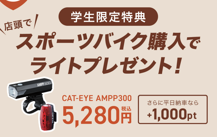 学生限定特典!完成車ご購入or納車時、学生証のご提示でキャットアイの前後ライトセット(¥5,280相当)をプレゼント!