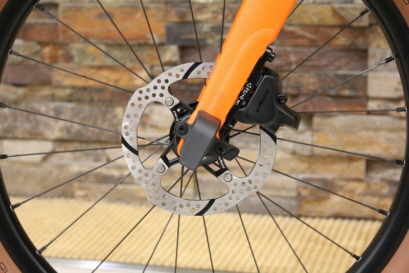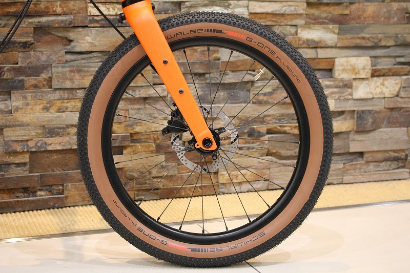 搭載するタイヤはSCHWALBE G-One Allroundを履いており、406規格の幅54㎜と、とても太いセミブロックタイヤを装備しています。