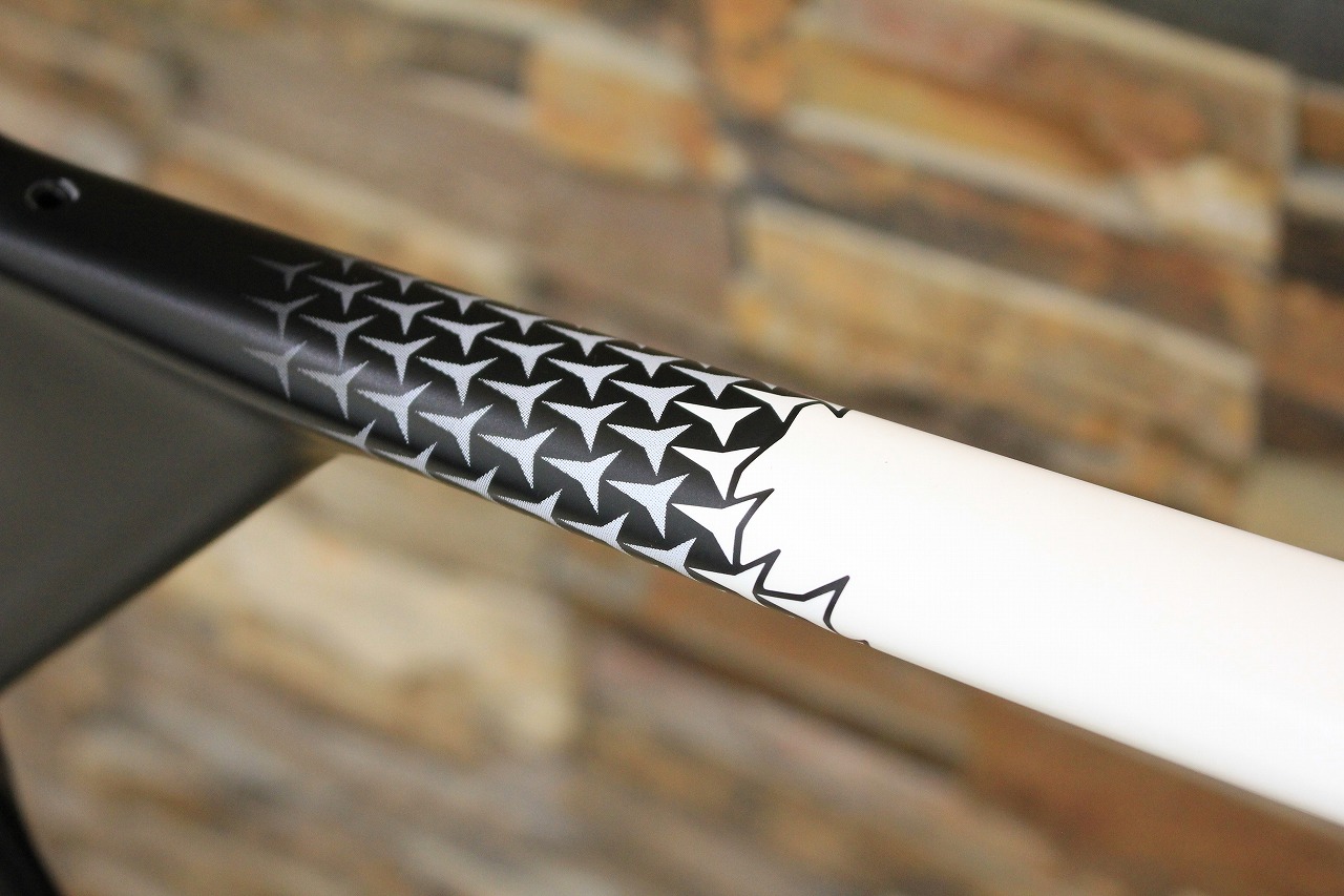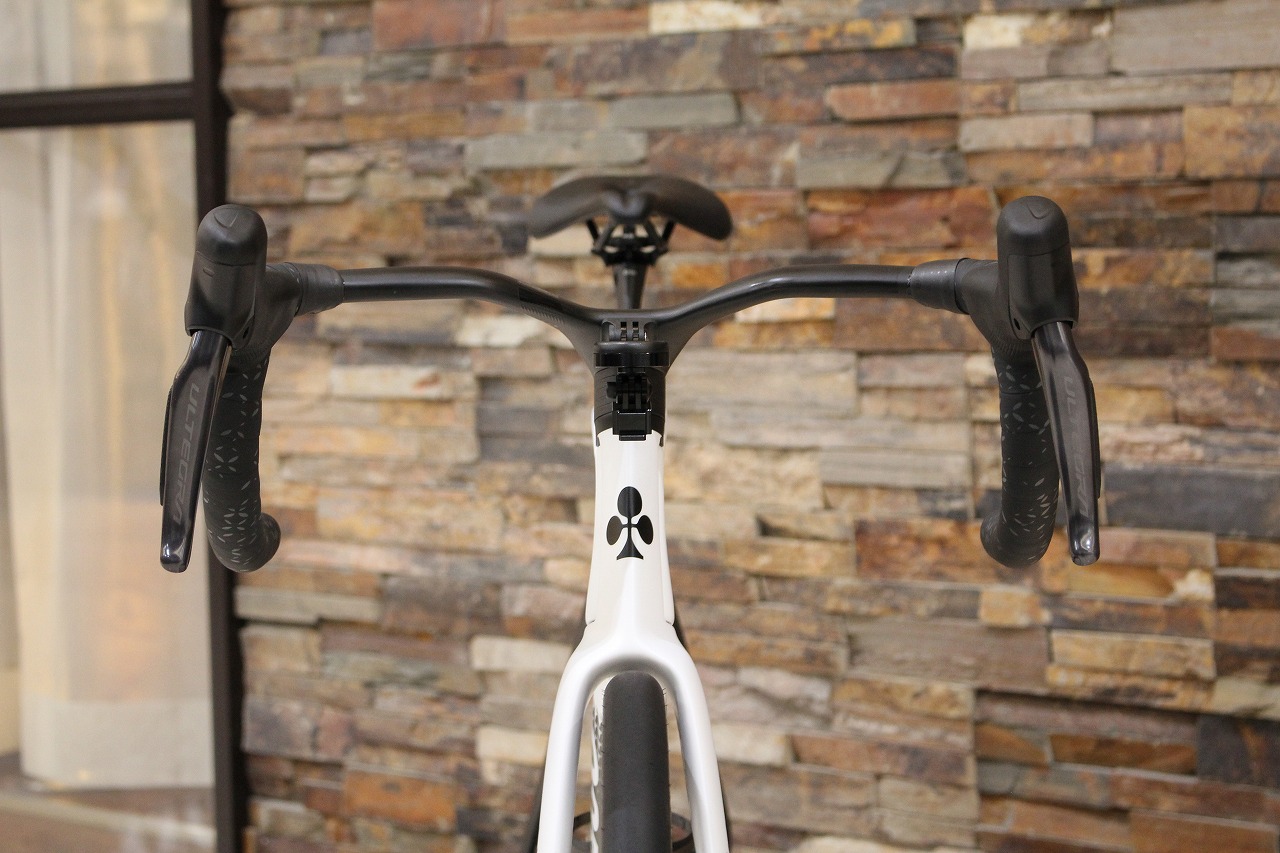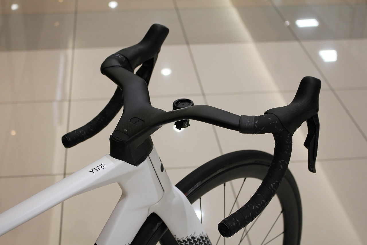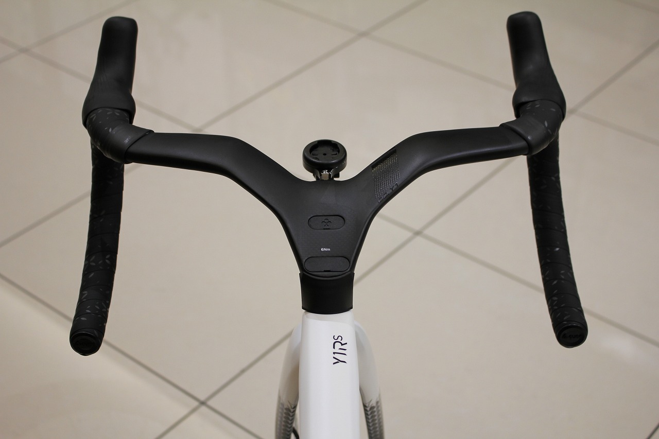 スペーサーを積んだ状態でも空力性能に長けた専用ハンドルバー。幅がコンパクトでフレア形状になっており、上でも下でも握りやすいです。