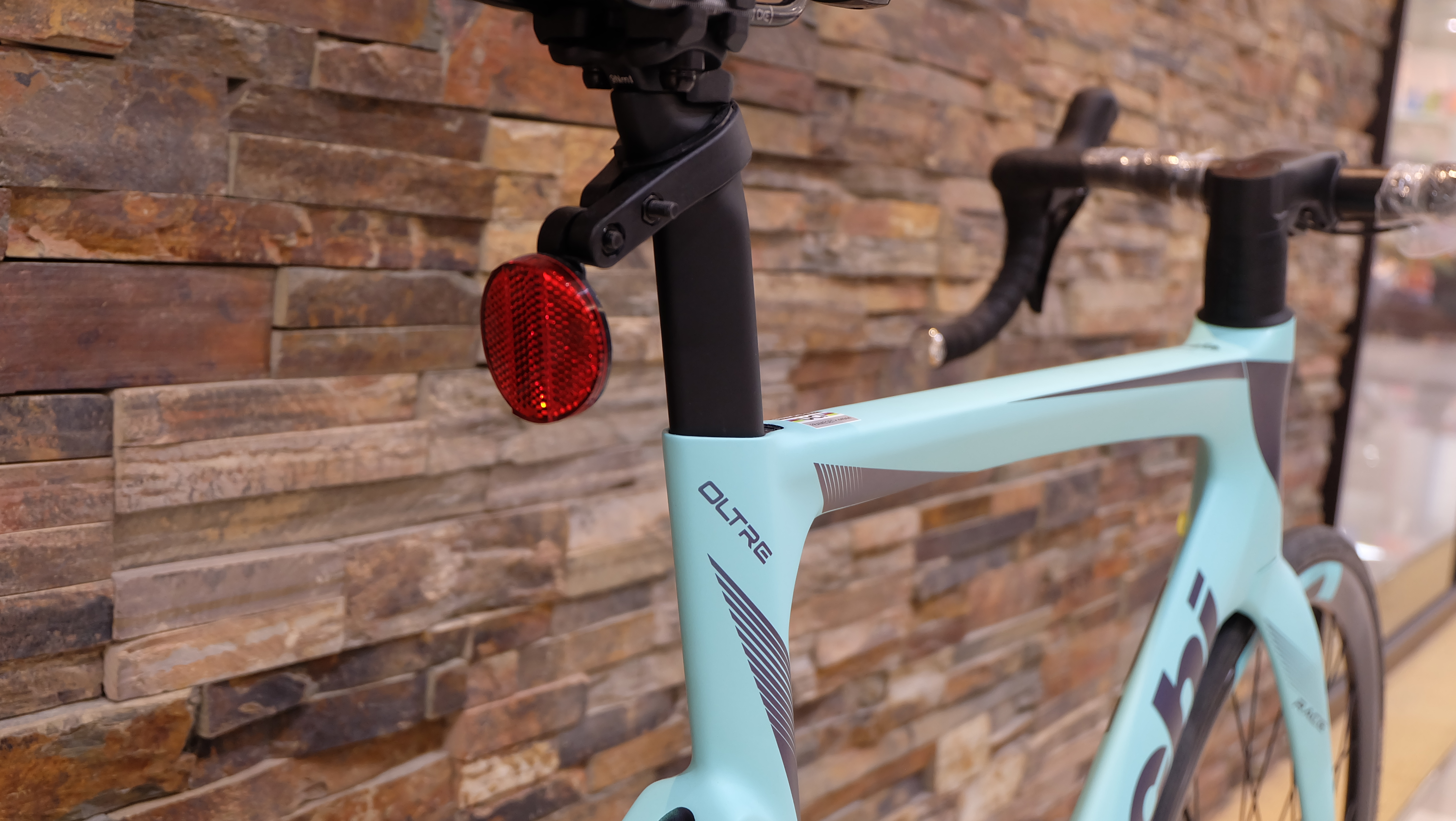 OLTRE COMPなどの上位モデルと比べると印象がことなりますが、OLTREというだけあって高いエアロ性能をもっています。まずはレーシングバイクらしいデザインのホリゾンタルフレームです。