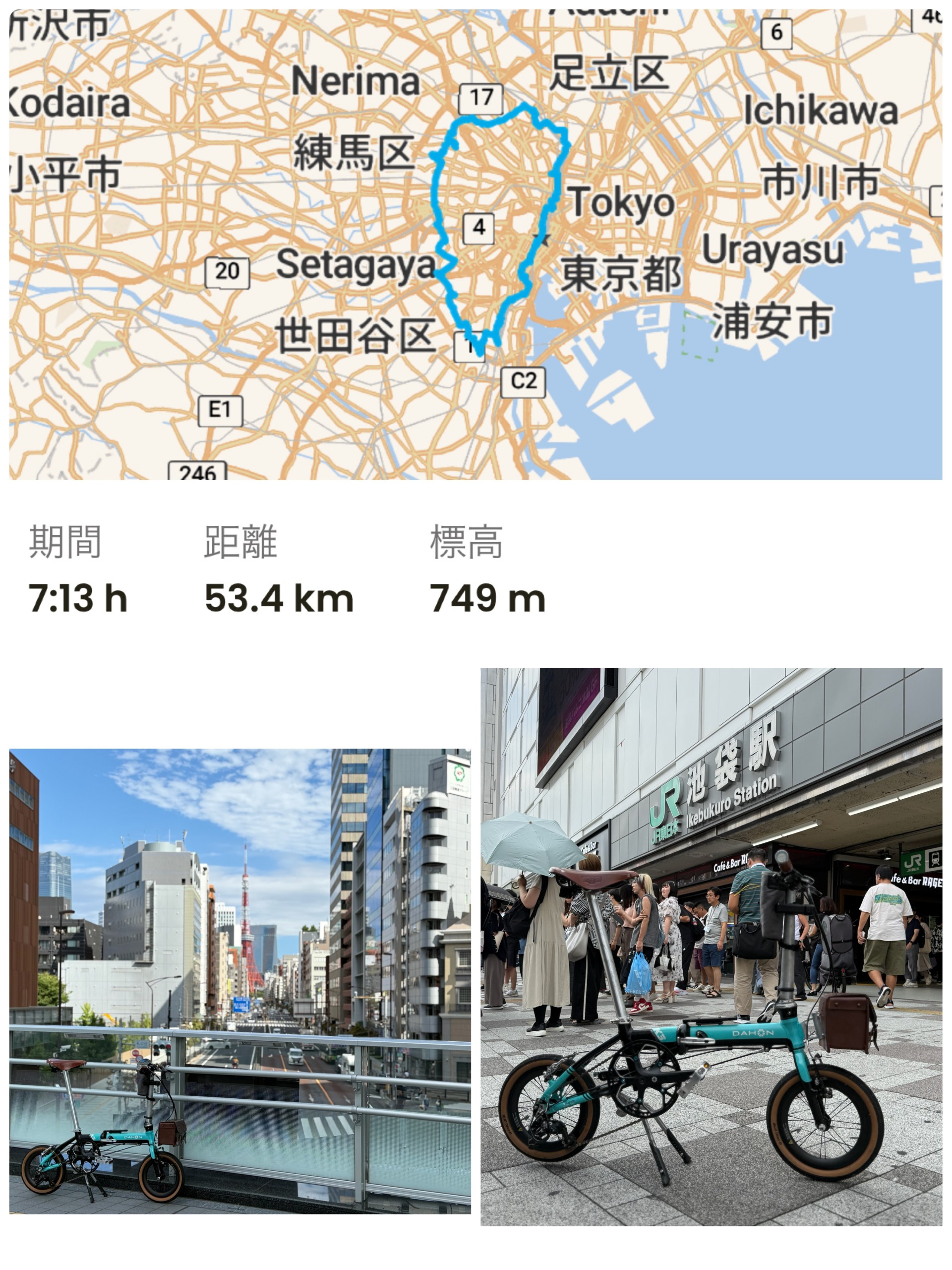 都内ですので山道はなく基本住宅街やビル街を走りました。以外に坂が多く踏ん張る場面がありましたが、ちょっとした坂道もなんなくいけるギア構成になっているため座った状態でも漕げる事が出来ました。このように折り畳み自転車では通常のロードバイクより走行性能は劣るものの持ち運びしやすいを武器にどこへでも行けますし、ある程度の距離は余裕に漕げちゃいます。※車体と人にもよる
