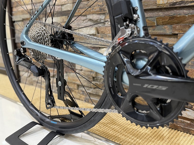 フルカーボンで、さらに105DI2を搭載しており快適なシフト操作や、ガーミンなどのサイコンと連携してギア位置やバッテリー残量が見れたり、ワイヤレスになったことでハンドル回りがスッキリするなど様々なメリットがあります。また、ディスクブレーキになるので高い制動力を持ちます。レーシーな車体ですのでレースなどに出られた際は高いパフォーマンスを発揮します。ですが値段があまりにも高くなかなか手が出せなかったりしますよね…