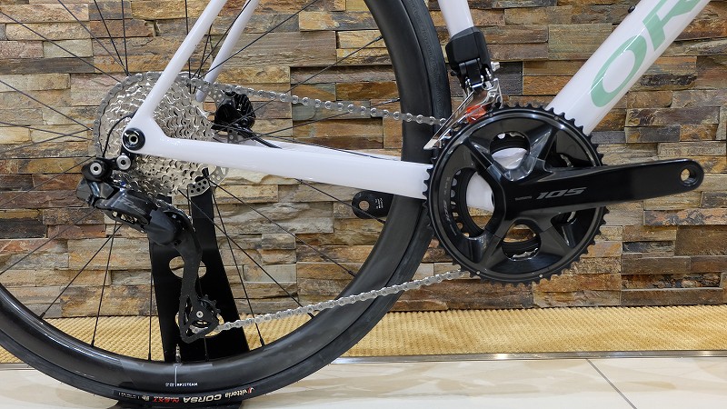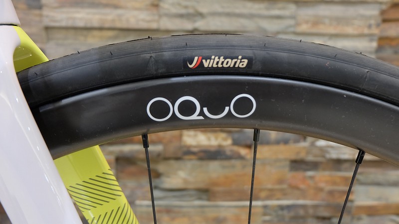 ホイールにはオルベアのホイールブランドのOQUOが装備されています。リムハイトは35mmとオールラウンドに使いやすいリムハイトになっており重量は前後で1465gとなっています。