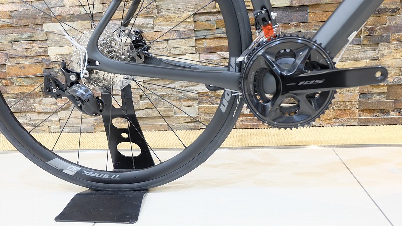 コンポーネントには信頼性の高いShimano 105(R7100系 12速)を採用。フロント50-34T、リア11-34Tのワイドギアにより、平坦からヒルクライムまでスムーズな変速を実現します。ディスクブレーキは軽いタッチでしっかり制動し、長距離でも安定したブレーキングが可能です。
