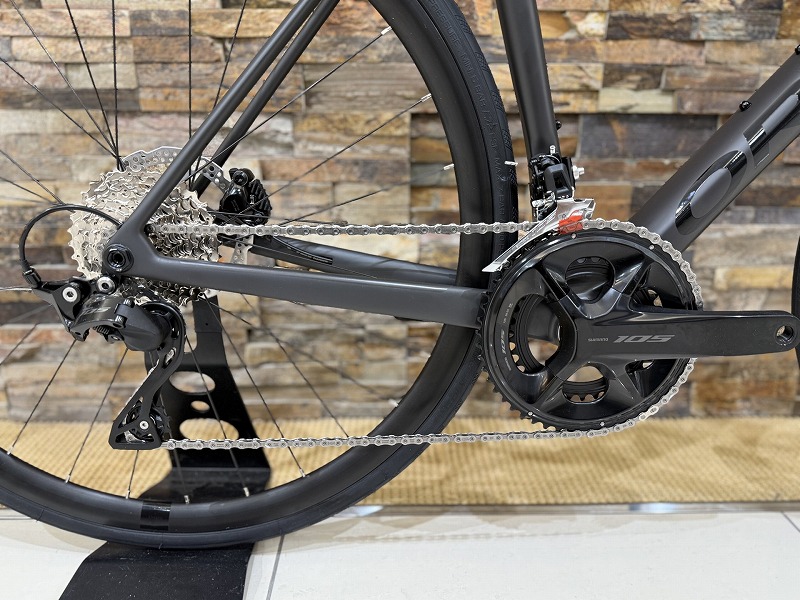 最新の105の12速を使っていたり、タイヤ幅の主流が大きくなっている現在。今後大きくなることを考え、フレームのクリアランスも広く作られており、最大32Cまで対応可能なので太めのタイヤを履かしまるでマットレスの上を走ってると勘違いしてしまうぐらい乗り心地を向上させることも可能です。