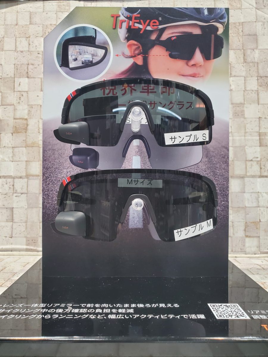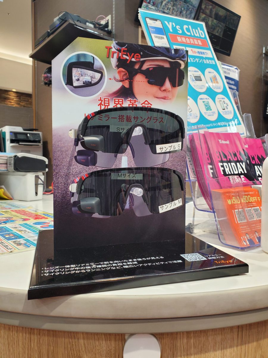 そうした課題を解決するために登場したのが、今回日本そしてワイズロード広島店に入荷したリアミラーをレンズに一体化したサングラス「TriEye」。視線を少し動かすだけで後方の様子を確認できるため、安全性の向上だけでなくライド中のストレスを大幅に軽減してくれます。