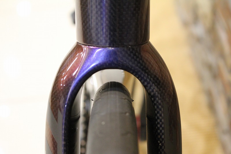 色合いが変化する塗装を半透明のコートでおおい、カーボン繊維の編込みの美しさを隠すことなく塗装しています。