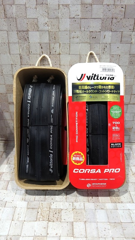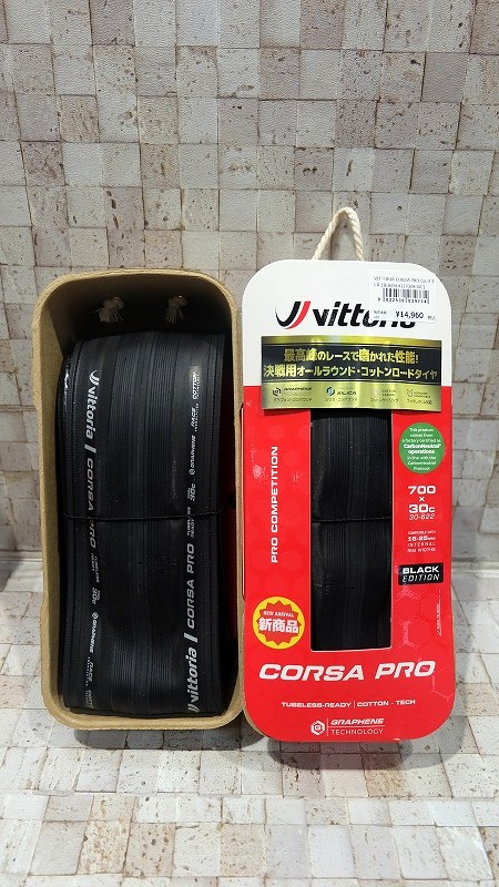 サイドウォールがブラックカラーに、統一感あるコルサ・プロも入荷しています。ブラックは一転、落ち着いた色合いでバイクを引き締める色になりそうですね!