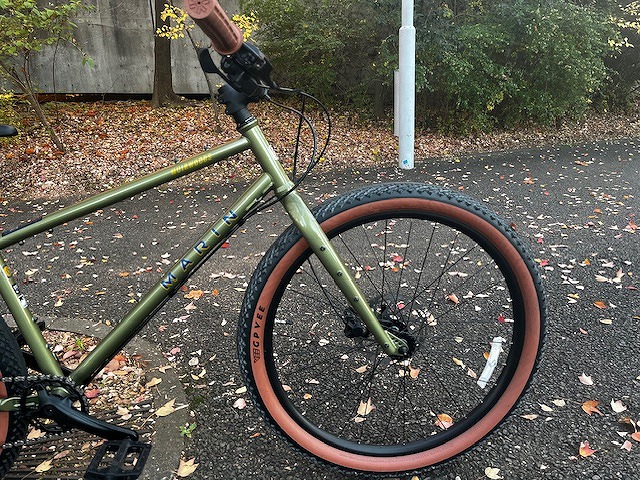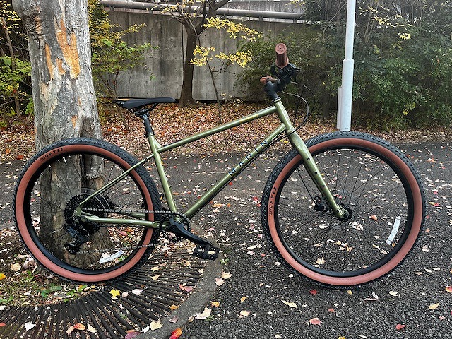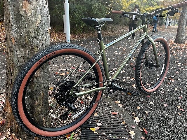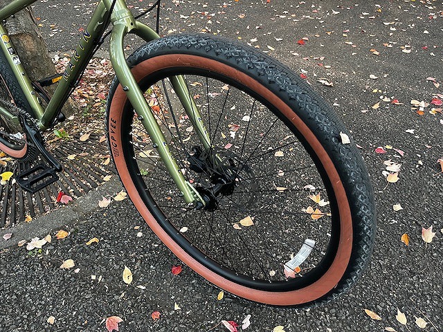 細身のスチールフレーム、極太タイヤ。タイヤのカラーもブラウンサイドを採用している。