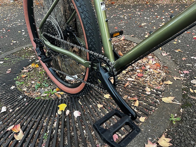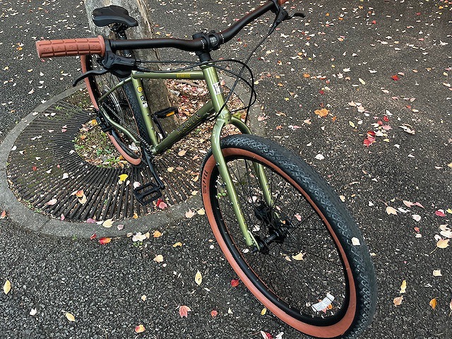 クロモリフレームのしなやかさ、街乗りにしては極太な2.35幅のセミスリックタイヤが段差やオフロードにも導いてくれる。
