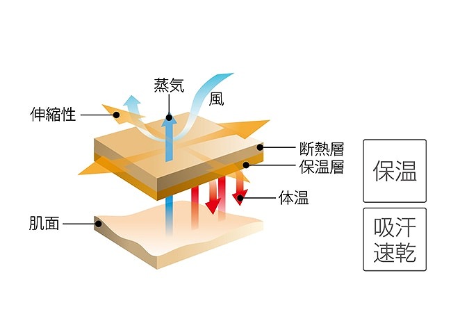 THERMODRESS NEOというリニューアルした生地で、ストレッチ性が大幅UP。重ね着の動きづらさを解消しています。また保温と吸汗速乾にも優れ、肌面は起毛加工されているので温かみを感じやすい!