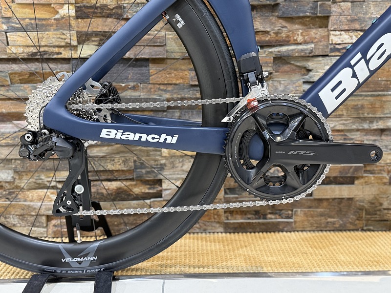 本バイクは105DI2を使用しており、変速の正確性、快適性、楽しさすべてを持っています。ボタンを軽く押すだけで変速し、ロングライドをしても手の疲労が圧倒的に違います。機械式ディスクブレーキの変速レバーと比べレバーが小さいので女性の方でも包み込めるぐらいの大きさとなっております。